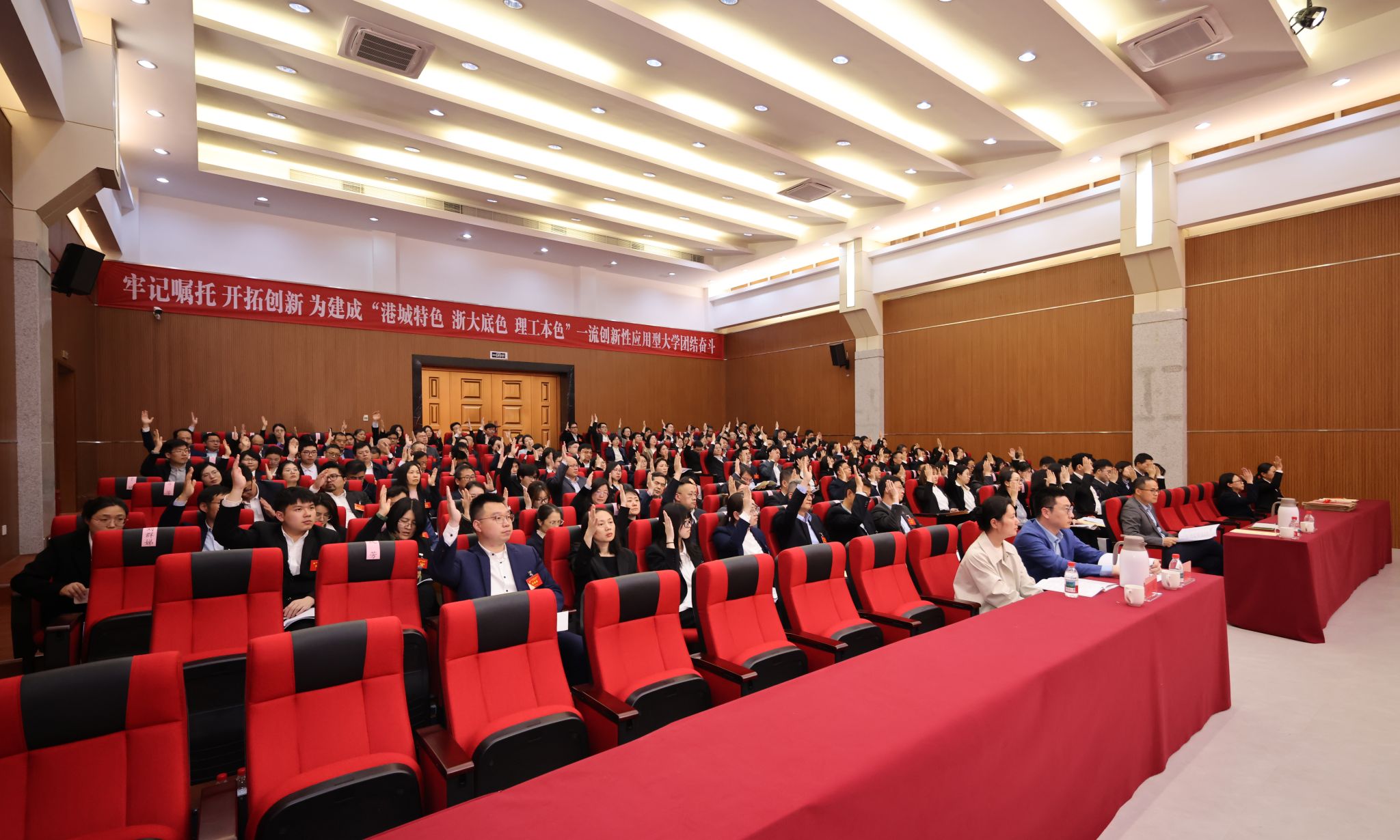 大会号召,全校各级党组织、全体共产党员和广大师生员工要更加紧密地团结在以习近平同志为核心的党中央周围,牢记嘱托、开拓创新,聚力攻坚、奋发有为,以“功成不必在我”的境界和“功成必定有我”的担当,全力建设具有“港城特色、浙大底色、理工本色”的一流创新性应用型大学,在教育强国、科技强国、人才强国建设大场景中展现浙大宁理担当、贡献浙大宁理力量,向着更加灿烂的明天奋勇前进!