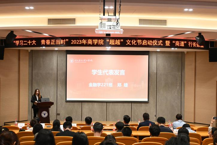 商学院团委副书记徐朵同学介绍了“超越”文化节内容。本次“超越”文化节共包括六个板块,涵盖思想教育、学风建设、学术科技、文艺体育、公益服务、职业规划等领域,共有34个系列活动。从理论学习到志愿服务,从文艺活动到体育赛事,从创新创业到学科竞赛,为青年学子搭建平台,提供舞台,创建擂台。 金融学221班郑婕同学代表商院学子向青春发声,在积极参加活动中开阔眼界、增长才干。