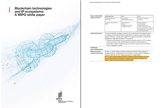 传媒与法学院吴泓老师发表的SSCI论文(‘Electronic Evidence in the Blockchain Era: New Rules on Authenticity and Integrity’, Computer Law & Security Review , Volume 36, April 2020,SSCI 1区)被联合国下属专门机构“世界知识产权组织(WIPO)”2022年发布的《区块链技术和知识产权生态系统白皮书》(Blockchain Technologies and IP Ecosystems: A WIPO White Paper)引用。