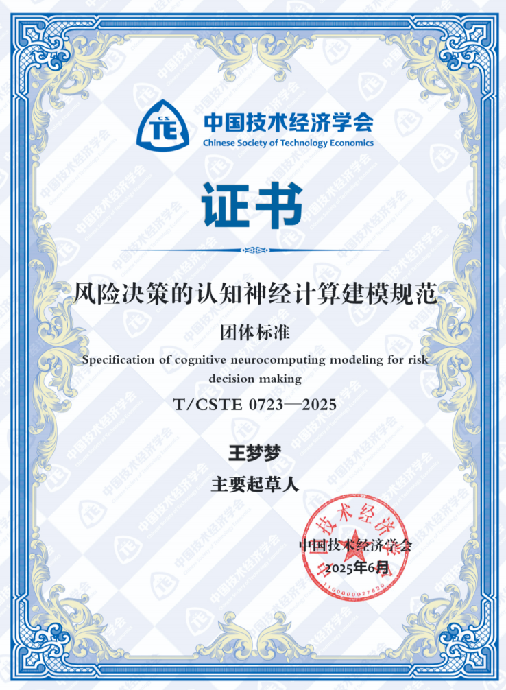近日,由商学院王梦梦博士作为核心专家主导起草的团体标准《风险决策的认知神经计算建模规范》正式发布实施。该标准系统规定了风险决策中认知神经计算建模的关键技术要求与检测方法,适用于该领域模型构建、分析与应用的全过程。作为国内首个聚焦“认知神经计算”与“风险决策”交叉融合的技术标准,该标准的发布标志着我国在前沿交叉领域规范化建设迈出重要一步,不仅填补了相关研究与应用的标准空白,也为脑科学、人工智能与行为决策研究的深度融合提供了系统支撑。该标准的实施将有效推动决策科学的智能化、精准化发展,服务于金融、医疗、应急管理、数字营销等多个高风险、高决策密度领域,为企业与政府在复杂环境下的科学决策提供新范式和技术依据。