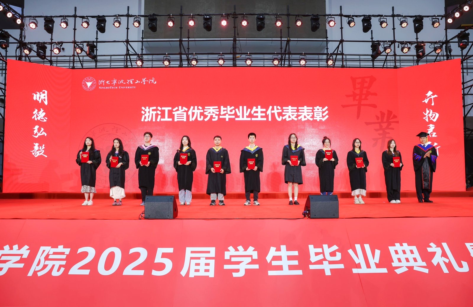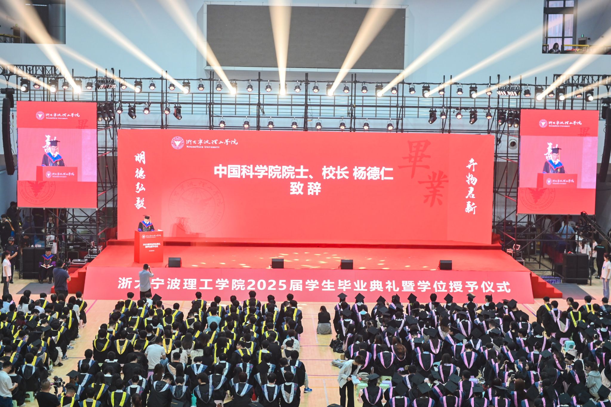 校长杨德仁院士对在场的毕业生致以诚挚的寄语:“做驭变求新的青春答卷人!”四年前,毕业生们在中国共产党成立100周年的喜庆时刻来到浙大宁理,与这所拥有“求是”精神血脉的校园不期而遇,在浙大宁理茁壮成长,成绩斐然。四年后,毕业生们迎来了一个加速变革的时代,将成为“与技术共处、与时代共舞”赛道的探界者。杨德仁校长表示,期待毕业生们:一是要精准识变,从变革浪潮中锚定人生航向;二是要主动求变,于未知深水区勇闯创新蓝海;三是要科学应变,在复杂困局中开辟发展通途。主动学习、持续思考,将“识变”的能力内化为成长的基石;永不言弃,让每一次对舒适区的突破,都成为锻造硬核实力的熔炉;让每一次精准应变的抉择,都成为丈量成长的刻度,不断提升应变能力,让每一回从容破局的智慧,都化作滋养心灵的甘露。祝愿毕业生们:以“识变”之清醒、“求变”之果敢、“应变”之智慧,在历史的卷轴上挥毫泼墨,绘就精彩人生!