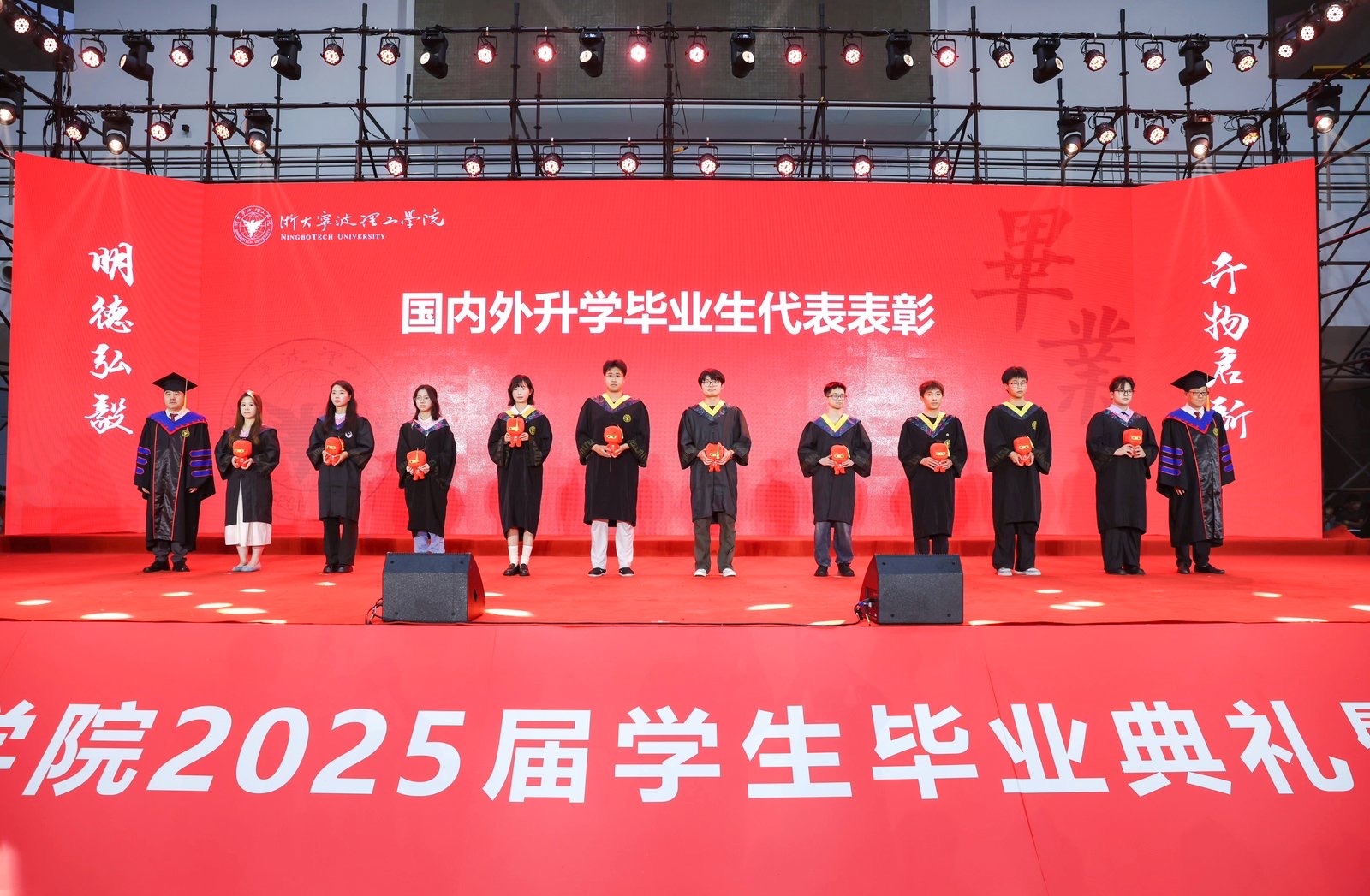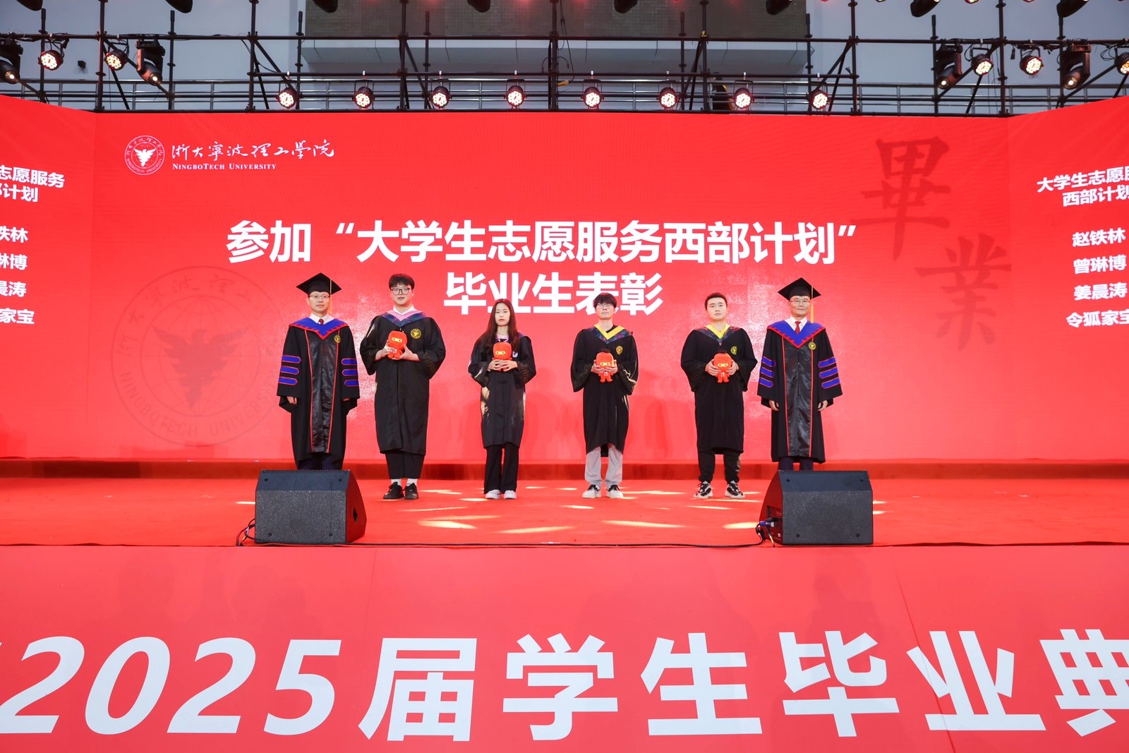 学校党委书记徐方,副校长章献民、鲁东明、胡余波、张荣祥分别为浙江省优秀毕业生代表、国内外升学毕业生代表、“大学生志愿服务西部计划”毕业生代表表彰并赠送纪念品。