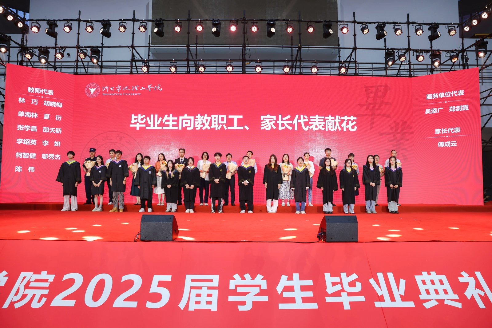 典礼现场,学校教职员工、在校生们通过视频为毕业生们送上真切的祝愿,祝福他们前程似锦,希望他们毕业后能够常回母校看看。毕业生们也向教师代表、后勤员工代表、家长代表献上鲜花,感谢他们一路走来的呵护与教导。老师的教导、员工的守护、家人的关爱默默流淌在时光里,给予了毕业生们再次起航的勇气和力量。