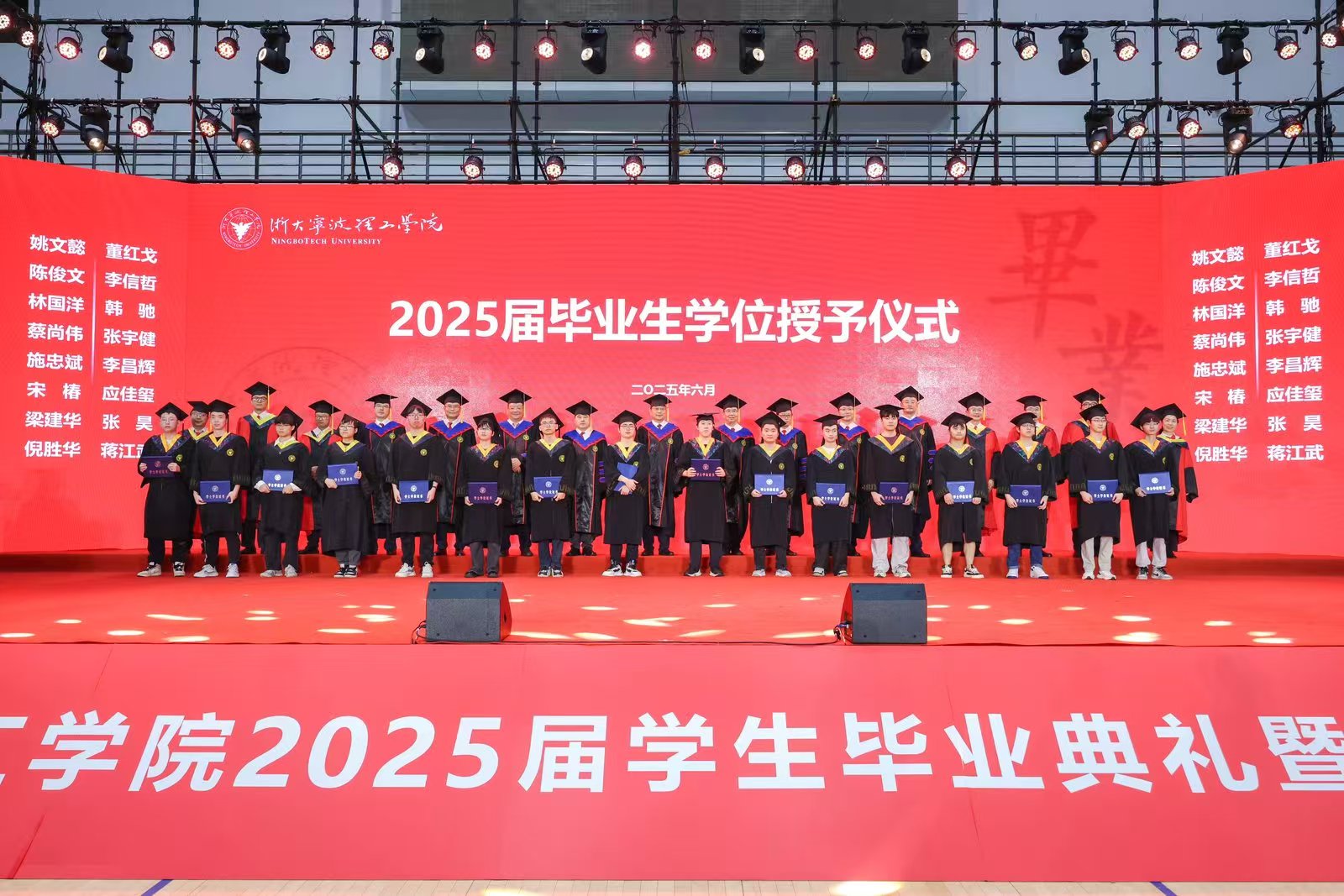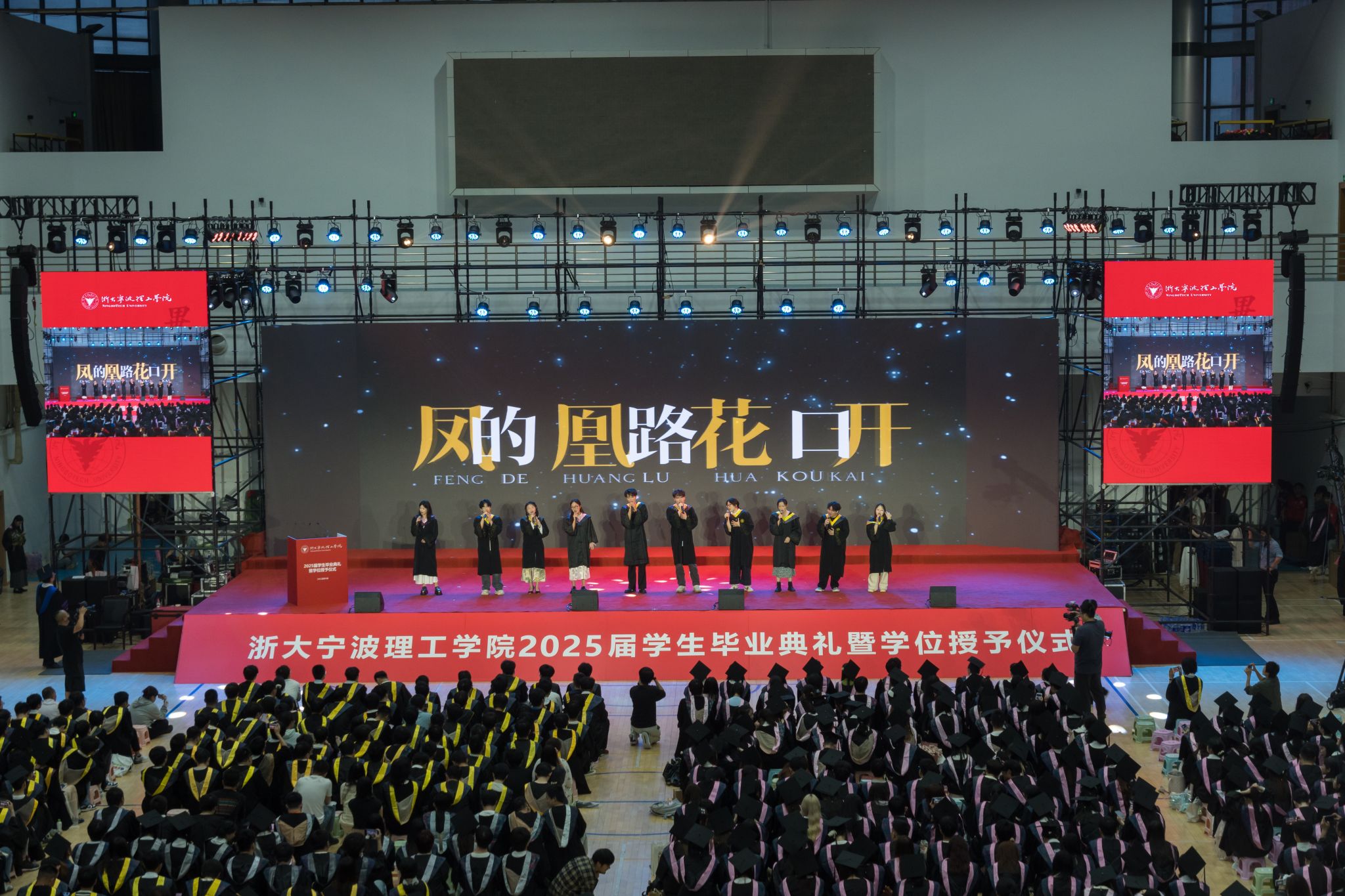毕业典礼在毕业生们深情演唱的《凤凰花开的路口》中结束。随后,举行了2025届毕业生学位授予仪式。副校长张荣祥主持授予仪式,并宣读2024届本科生学士学位授予决定。校领导、首席科学家、各学院院长及教师代表共同为毕业生拨穗,并合影留念。