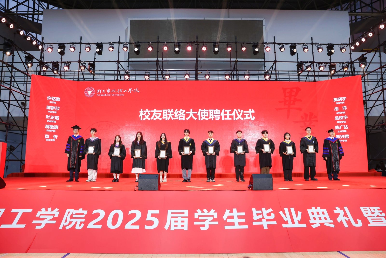 典礼上还举行了校友联络大使聘任仪式,学校纪委书记胡文汉、党委副书记杨国富为新任校友联络大使颁发聘书。今天过后,毕业生即将成为浙大宁理校友。校友是学校的宝贵资源和财富,也是学校最好的名片,希望毕业后各位校友能够积极联系母校,常叙师生情、凝聚同窗谊,为母校和校友事业的发展做出积极贡献。