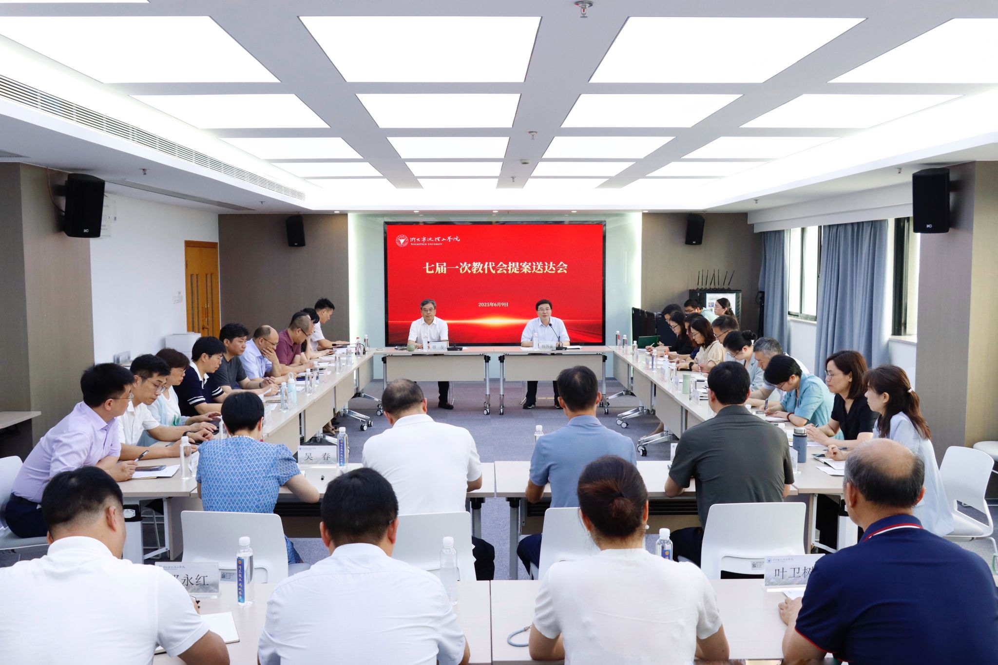 6月9日下午,七届一次教代会提案送达会在行政楼606会议室召开。教代会提案委员会委员、各代表团团长、各部门主要负责人参会。学校党委书记徐方出席会议,学校党委副书记、校工会主席杨国富主持会议。