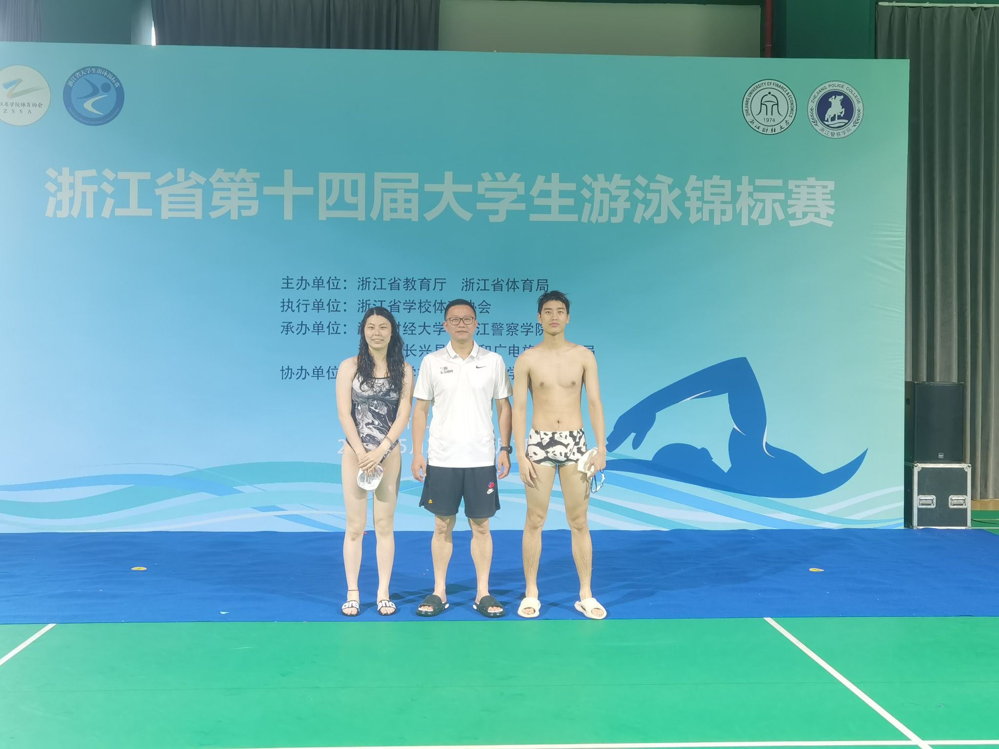 2025年5月28日至6月1日,浙江省第十四届大学生游泳锦标赛在湖州长兴百叶龙龙山文体中心游泳馆隆重举行。这场汇聚全省52所高校439名选手的"水上争霸赛",上演了一场场扣人心弦的精彩对决。在洪煦教练的精心指导下,我校游泳队表现抢眼,张志杰同学以1分12秒的惊人成绩斩获男子甲组100米蛙泳金牌,并在50米蛙泳项目中摘银;蔡佳琦同学获女子甲组50米自由泳第四名、100米自由泳第七名。