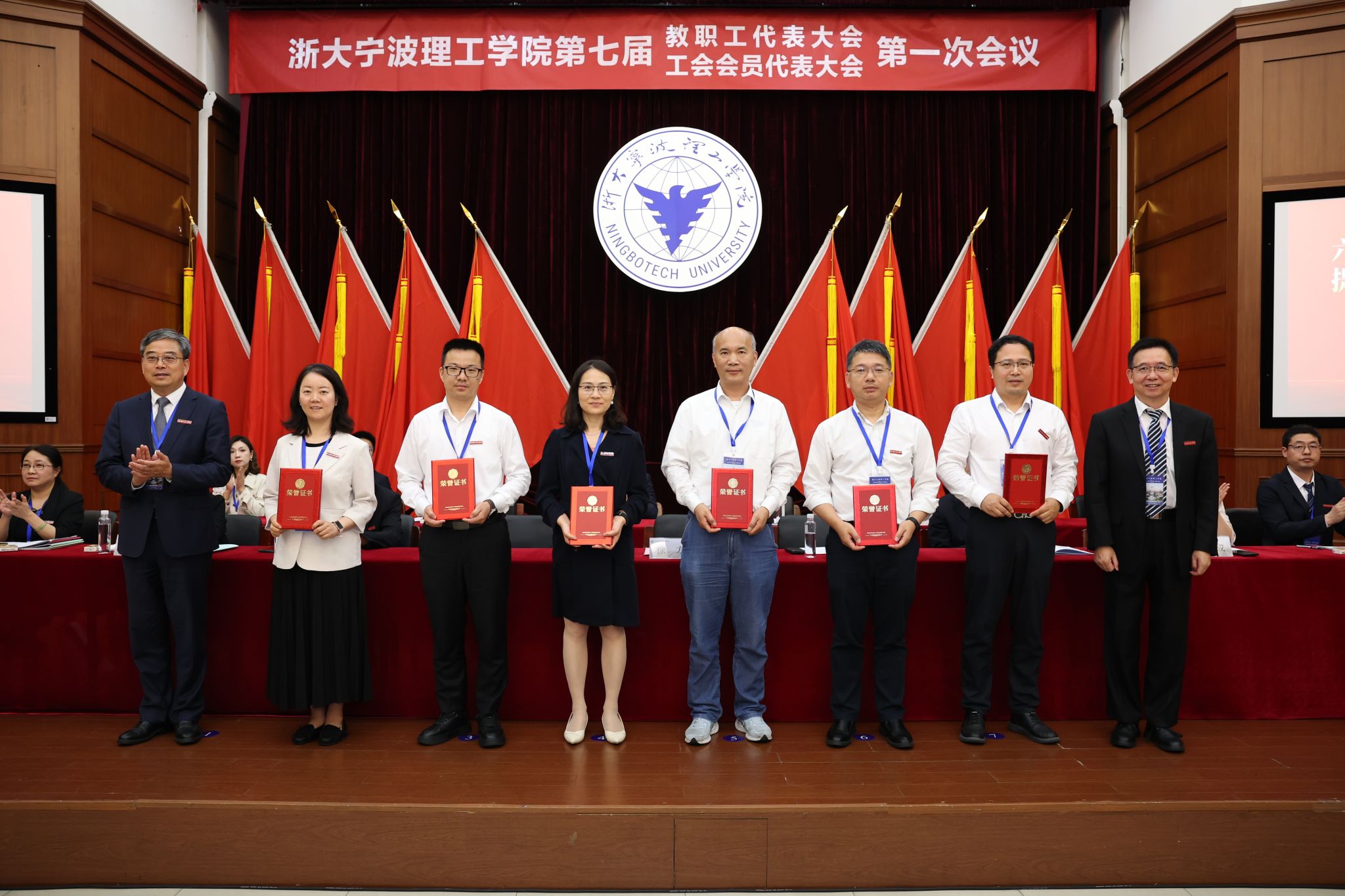 大会还表彰了第六届教职工代表大会、工会会员代表大会第三次会议优秀提案和提案办理优秀部门,徐方、杨德仁为获奖代表和单位颁奖。开幕式上,宁波市教育工会主席龚松林致辞,他高度肯定了学校工会过去三年取得的工作成效,寄语新一届工会委员会勇担使命、服务师生;学校团委书记聂迎娉代表群团组织致贺词。