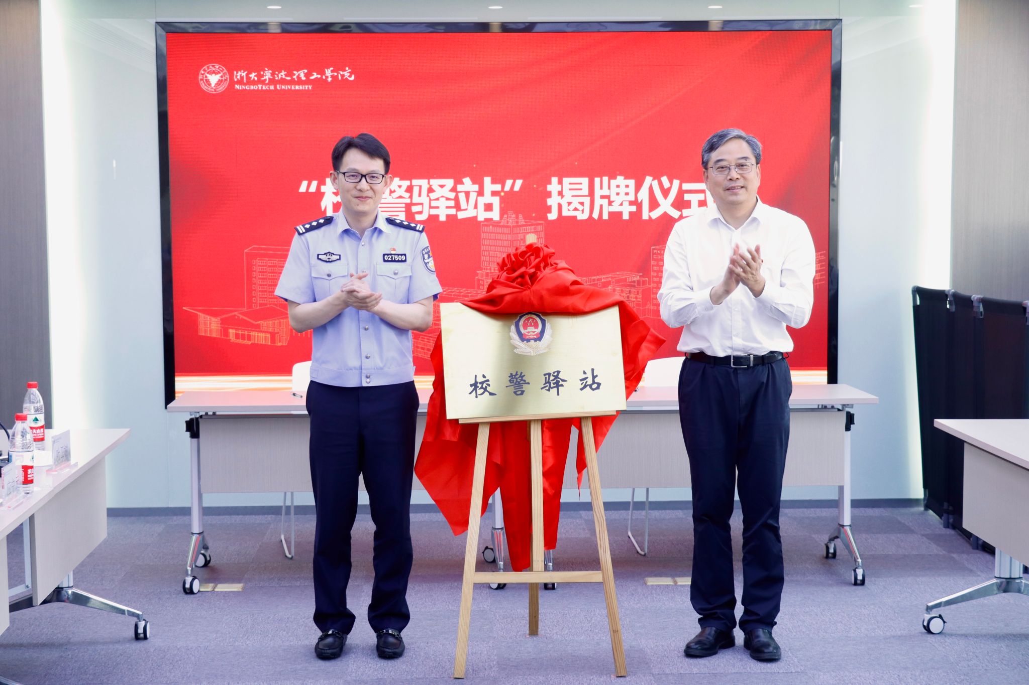 活动现场,徐方与俞其共同为我校“校警驿站”揭牌。“校警驿站”作为校园安全服务的“前哨站”,将集安全教育、应急响应、便民服务等功能于一体,驻校民警与学校安保部常态化入驻,相关业务部门专项入驻,通过多方参与、整体联动打通服务师生“最后一公里”,成为校园平安建设的“前沿阵地”。