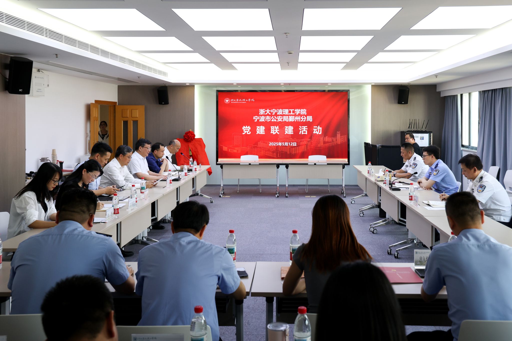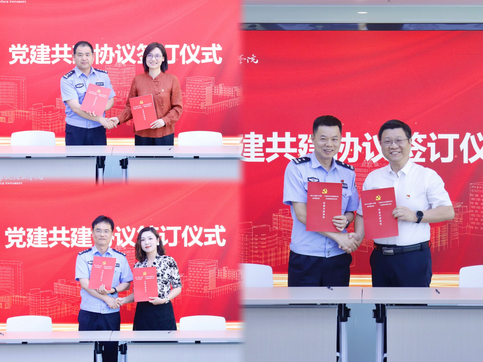 为全面落实浙江省“平安高校”建设战略部署,深化“校-警-社”协同共治机制,进一步强化以高质量党建引领警校共建工作走深走实,5月12日下午,学校与宁波市公安局鄞州分局举行党建联建活动。学校党委书记徐方、党委副书记黄光杰,鄞州区副区长、公安分局党委书记、局长俞其等出席仪式,公安分局及学校代表参加。
