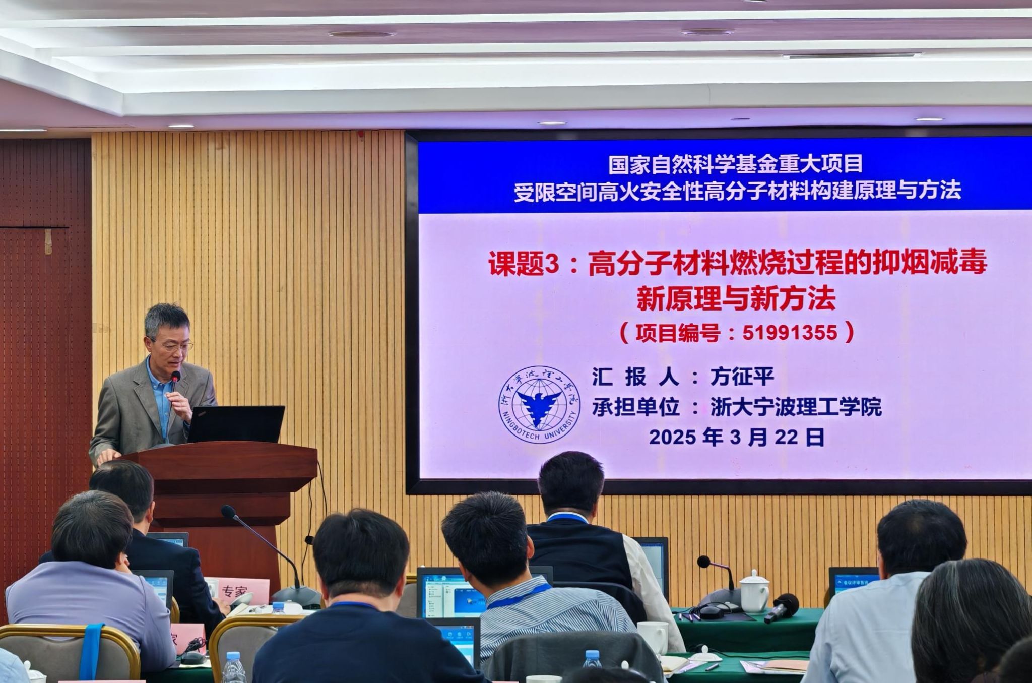 该项目是浙大宁波理工学院首个参与并独立承担课题任务的国家自然科学基金重大项目。在审查会上,方征平教授代表学校火安全材料团队,就课题三“高分子材料燃烧过程的抑烟减毒新原理与新方法”(编号51991355)的研究进展进行了详细汇报。