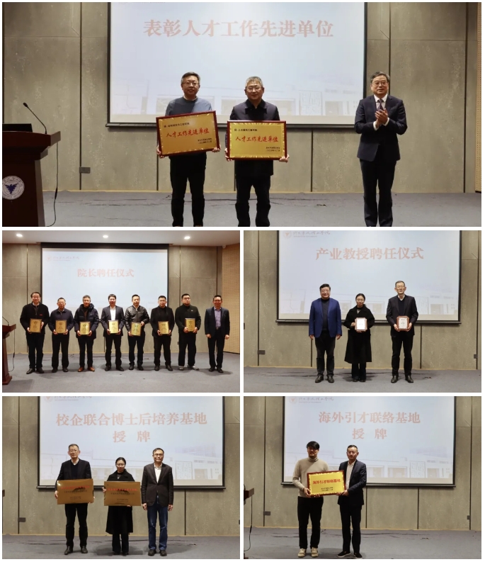 会议还举行了聘任、授牌和表彰仪式。徐方为材料科学与工程学院、土木建筑工程学院两家2024年学校人才工作先进单位颁发了奖牌。杨德仁为商学院院长苗青、传法学院院长吴飞、材料学院院长方征平、机能学院院长吴大转、信息学院院长苏宏业、生化学院院长侯阳、设计学院院长陈江等7位学院聘任制院长颁发了聘书。党委副书记黄光杰为宁波中淳高科股份有限公司张日红、宁波长阳科技股份有限公司周玉波颁发产业教授聘书。副校长张荣祥为宁波中淳高科股份有限公司、宁波长阳科技股份有限公司授牌成立“校企联合博士后培养基地”。学校纪委书记胡文汉为浙江海角数字科技有限公司授牌成立“海外引才联络基地”。