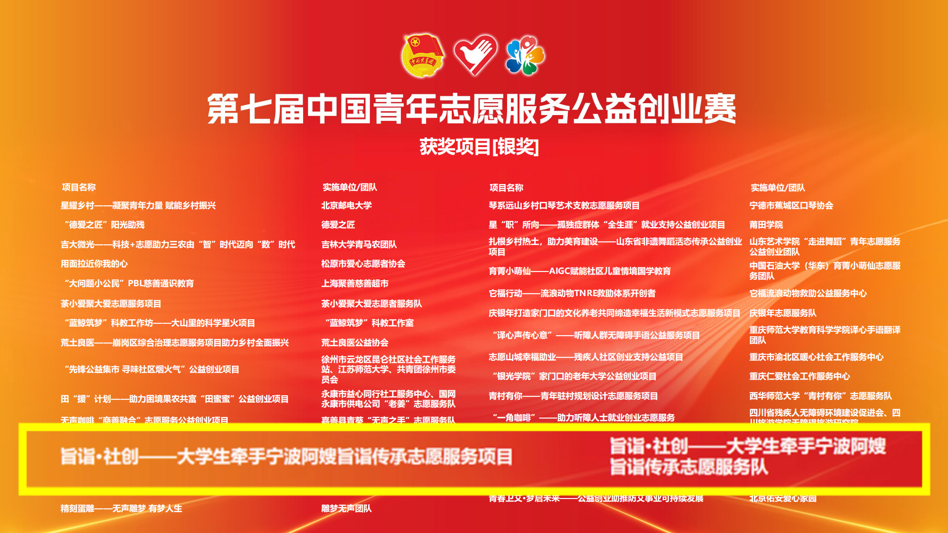 11月30日至12月1日,由共青团中央、中央社会工作部、民政部、水利部、文化和旅游部、国家卫生健康委员会、中国残疾人联合会和中共广东省委、广东省人民政府联合主办的第七届中国青年志愿服务项目大赛和第七届中国青年志愿服务公益创业赛在广东汕头市成功举办。