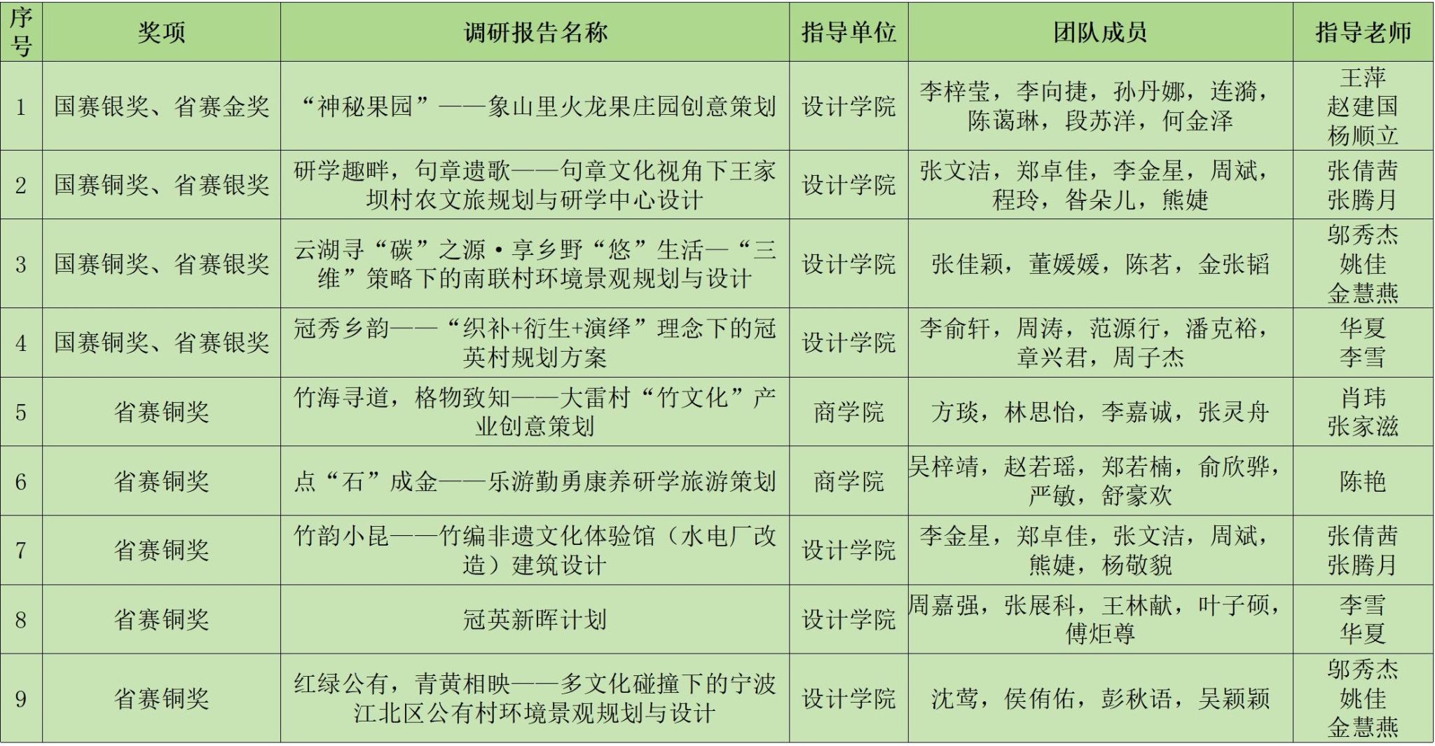 设计学院《“神秘果园”——象山里火龙果庄园创意策划》获国赛银奖、省赛金奖,设计学院《研学趣畔,句章遗歌——句章文化视角下王家坝村农文旅规划与研学中心设计》《云湖寻“碳”之源·享乡野“悠”生活—“三维”策略下的南联村环境景观规划与设计》《冠秀乡韵——“织补+衍生+演绎”理念下的冠英村规划方案》获得国赛铜奖、省赛银奖。