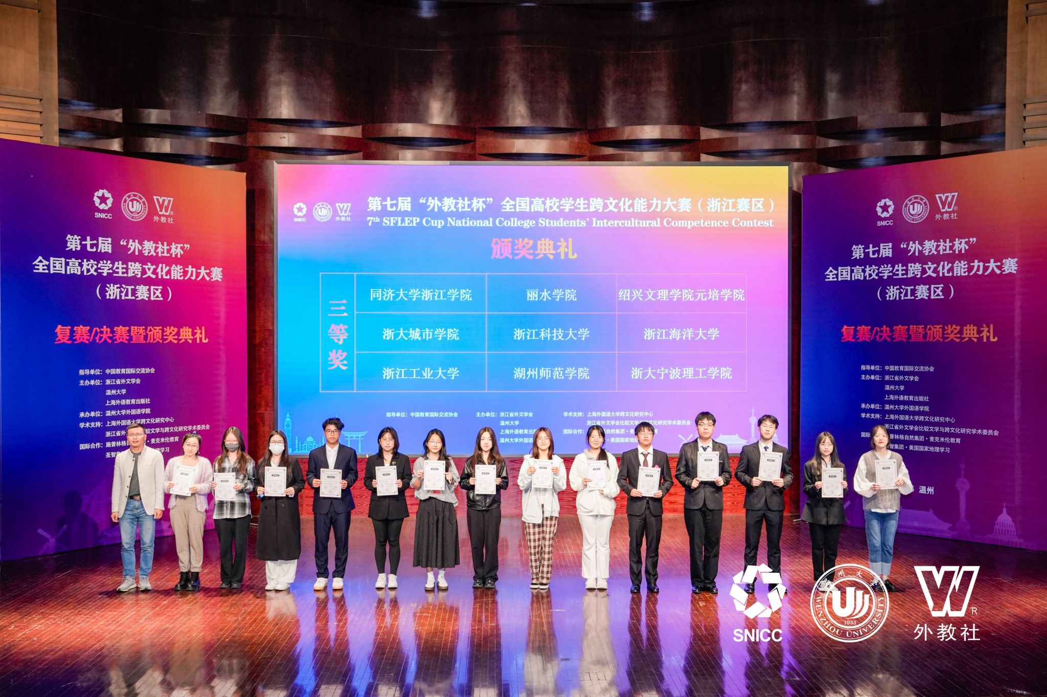 11月16日至17日,第七届“外教社杯”国高校学生跨文化能力大赛(浙江赛区)在温州大学成功举行。由我校英语专业张忆天、日语专业朱宇豪以及国贸专业丁林叶组成的学生团队,在外国语学院教师的指导与带领下,精心备赛、奋力拼搏,与来自全省高校的29支队伍同台竞技,展现了当代青年的跨文化交流能力与风采,最终摘得省级三等奖荣誉。