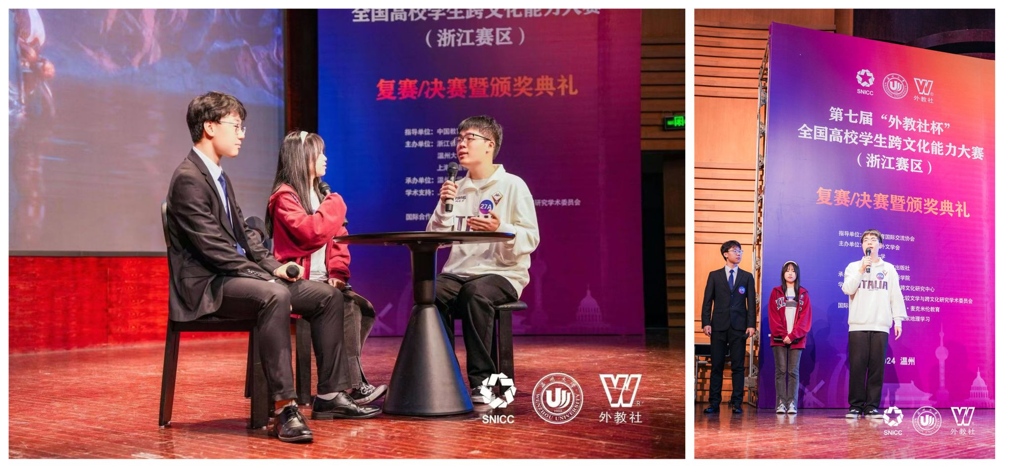 “外教社杯”全国高校学生跨文化能力大赛(浙江赛区)由浙江省外文学会、温州大学、上海外语教育出版社主办,由温州大学外国语学院承办,旨在培养具有中国情怀、国际视野、专业本领、跨文化沟通能力和全球胜任力的国际化人才。该竞赛为“全国普通高校大学生竞赛榜单”入选赛事,是外语类学科竞赛的权威赛事之一。外国语学院对本次大赛高度重视,通过剧本选题打磨、跨文化理论辅导以及剧本反复演练等方式积极开展省赛备赛。