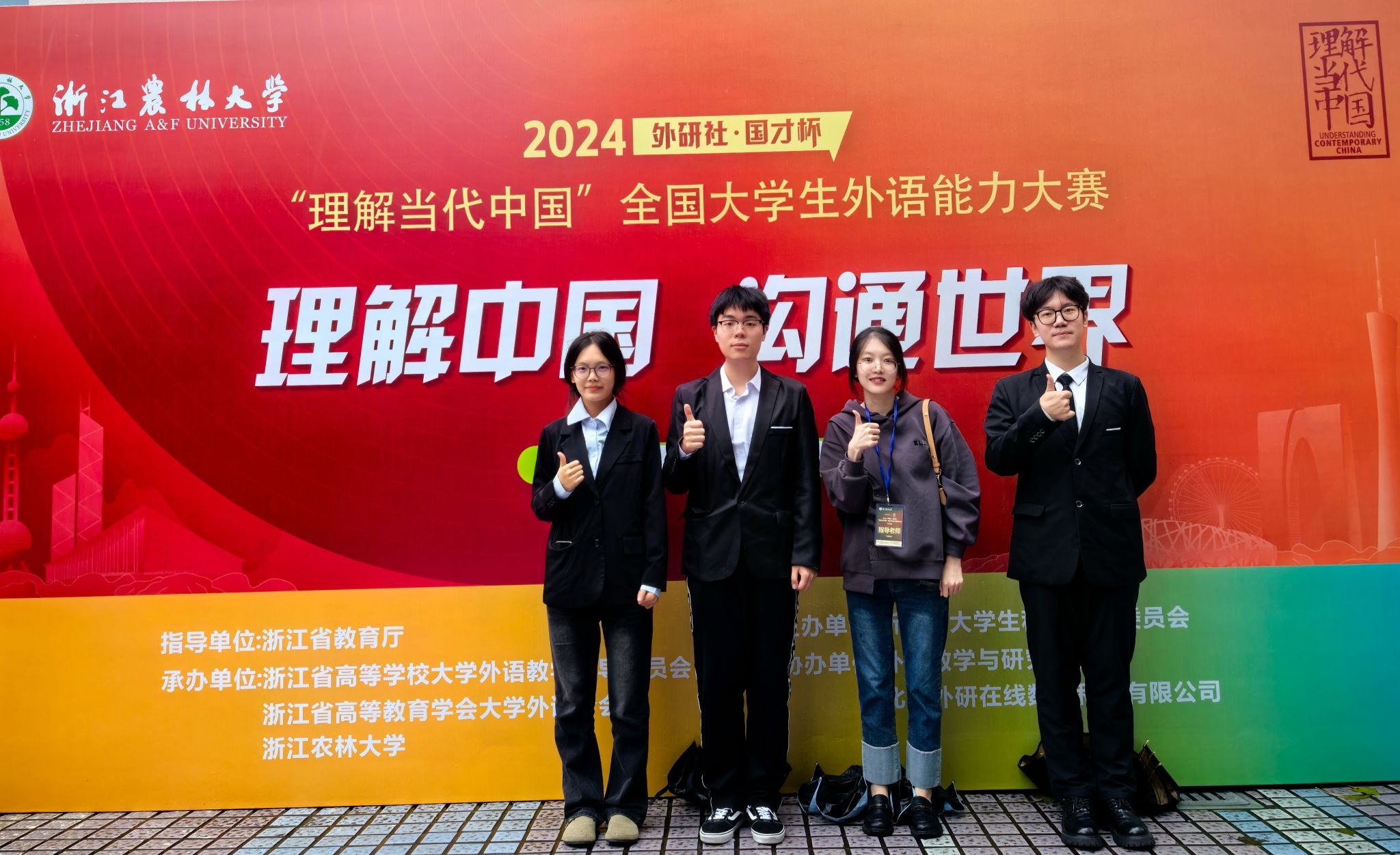 “外研社·国才杯”“理解当代中国”浙江省大学生外语能力大赛是原“外研社·国才杯”浙江省大学生英语演讲与写作大赛的全新升级赛事。赛题围绕习近平新时代中国特色社会主义思想核心内容展开,旨在培养更多有家国情怀、有全球视野、有专业本领的时代新人,对推动创新课程思政、深化外语教育改革、培育外语人才、讲好中国故事、服务国际传播具有重要意义。本次大赛由浙江省大学生科技竞赛委员会主办,浙江省高等学校大学外语教学指导委员会、浙江省高等教育学会大学外语分会及浙江农林大学承办,设有六大赛道,其中短视频赛道于10月11日结束,多语种组以及读写、笔译省级决赛分别于10月19日、26日线上举行,口译、演讲决赛于11月1-3日在浙江农林大学举行。本次竞赛指导教师团队由邓丽静、李继宏、林晶晶、陆莺、茅忆年、谢展眉、周维等教师组成,备赛过程得到了学院领导及系部老师的大力支持与帮助。
