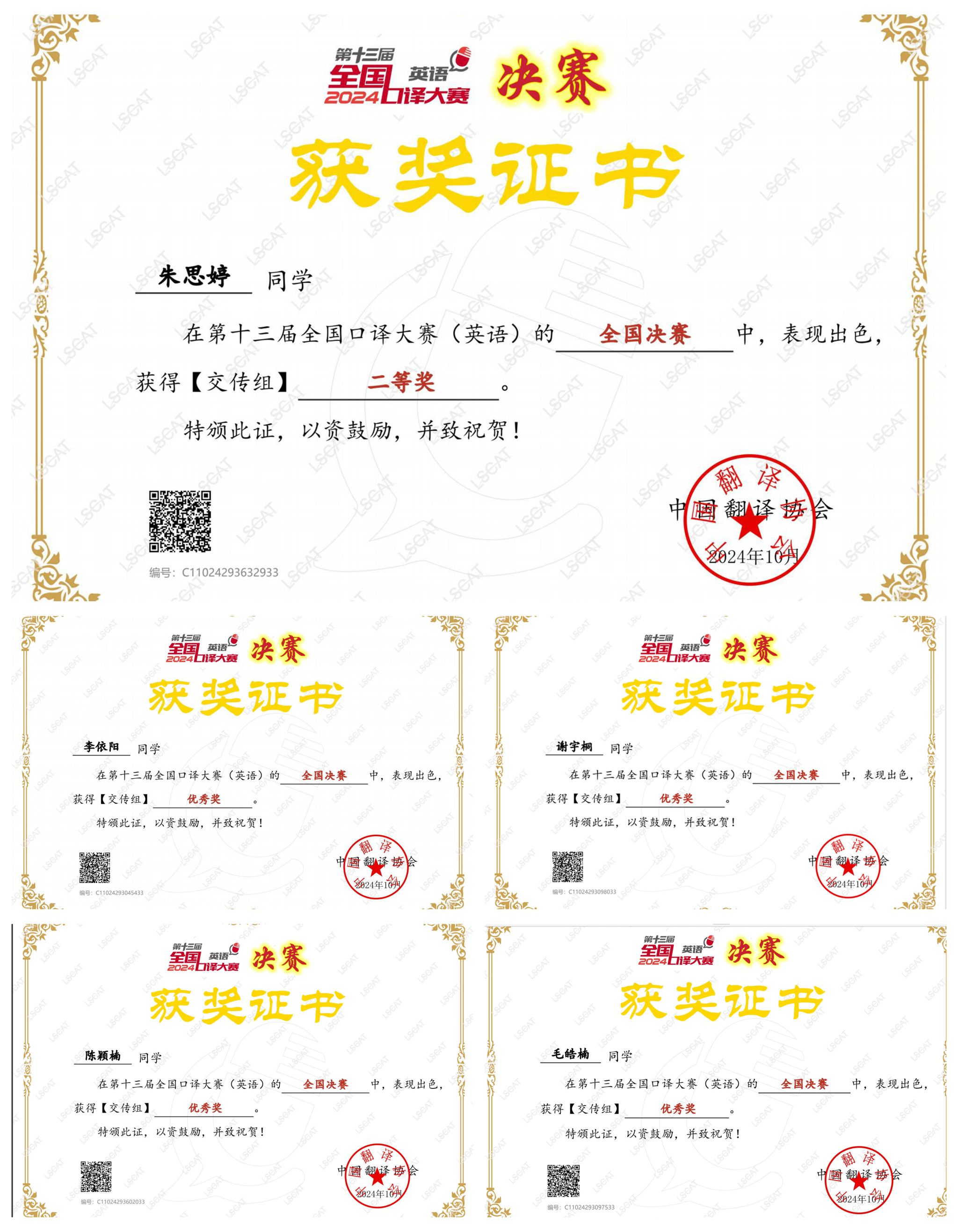 本届全国口译大赛于今年3月启动,采用省级初赛、省级复赛、全国决赛三级赛制。我校选派的14名选手中共有12位晋级省级复赛,其中陈颖楠同学获得省级复赛一等奖,朱思婷、毛皓楠、谢宇桐和李依阳等四位同学获得二等奖,张忆天、张淑婷、柳雨欣、李缘缘、章若煊、郑涵旭、邱子轩等七位同学获得三等奖。获得复赛一、二等奖的五位优秀选手顺利晋级全国决赛,在学校老师的指导下,积极备战,最终朱思婷同学荣获全国二等奖,全国排名第169名,创历史最佳成绩,李依阳、谢宇桐、毛皓楠、陈颖楠等四位同学荣获全国优秀奖。