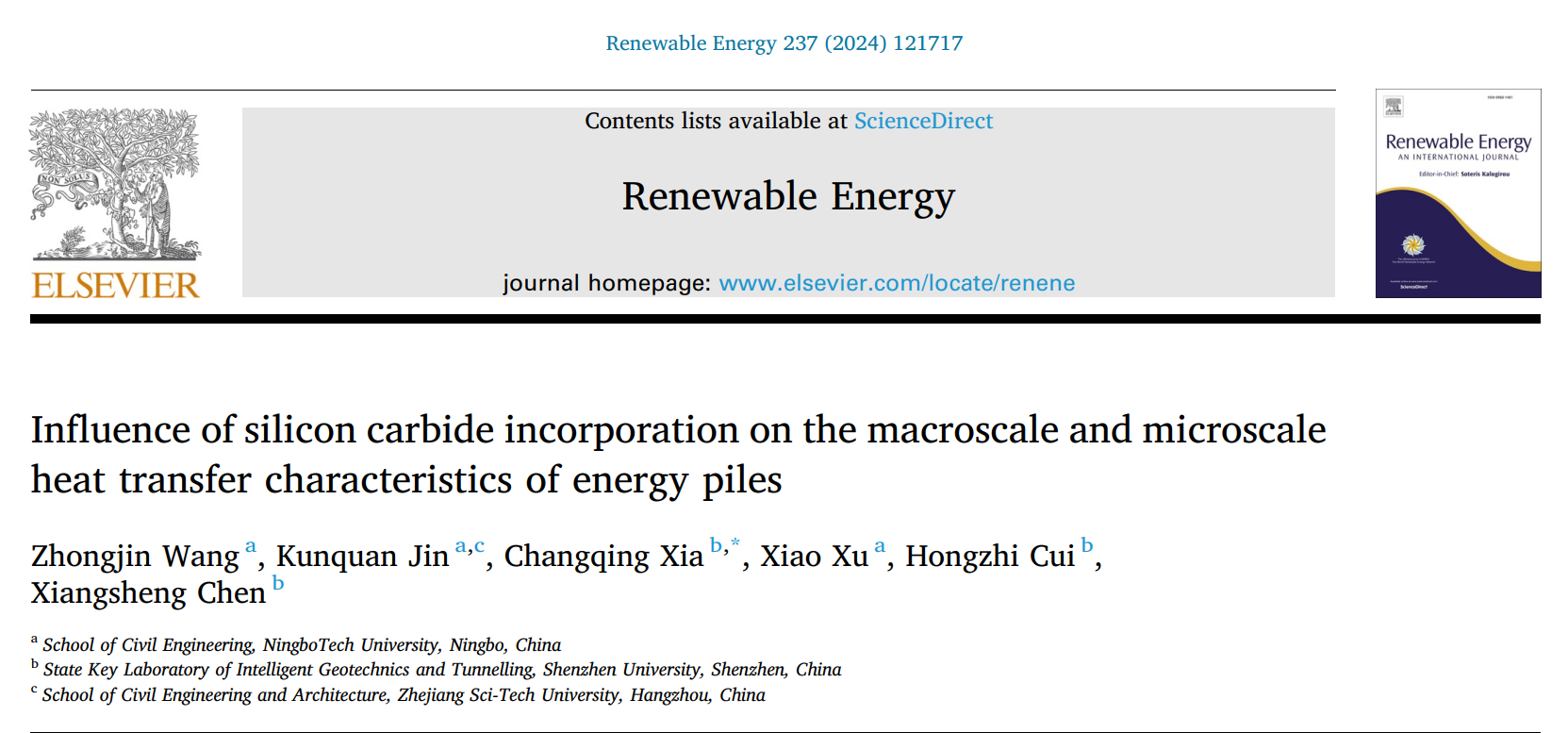 近期,我校土建学院教师王忠瑾与浙江理工大学联培研究生金坤铨等在能源领域国际权威学术期刊《Renewable Energy》上发表题为“Influence of Silicon Carbide Incorporation on the Macroscale and Microscale Heat Transfer Characteristics of Energy Piles”的研究论文。该研究成果得到宁波市青年科技创新领军人才项目(2023QL018)与国家自然科学基金(52478365)的支持。