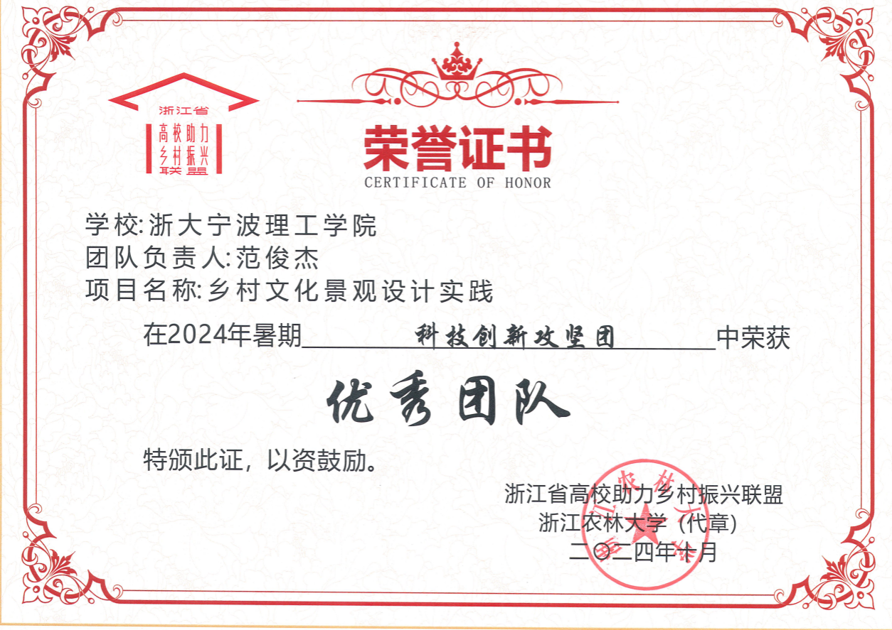 近日,浙江省高校助力乡村振兴联盟发布了2024年浙江省高校暑期服务乡村振兴工作优秀团队名单,我校设计学院范俊杰老师带领的“乡村文化场景设计”实践服务团荣获“科技创新攻坚团优秀团队”称号。