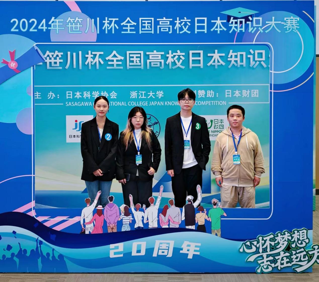 10月27日,2024年“笹川杯”全国高校日本知识大赛在浙江大学落下帷幕,来自北京大学、南京大学、中国人民大学、北京外国语大学、上海外国语大学、天津外国语大学等全国97所高校的400余名师生齐聚一堂,经过两天的精彩比拼决出了团体及个人赛的奖项。在指导教师李先瑞教授的悉心指导和学生们的不懈努力下,我校外国语学院日语专业2021级袁心雨同学脱颖而出,荣获个人三等奖。此外,袁心雨同学、俞靖晗同学、蔡佳颖同学荣获团体优秀奖,李先瑞老师,余祎延老师荣获杰出指导教师奖。