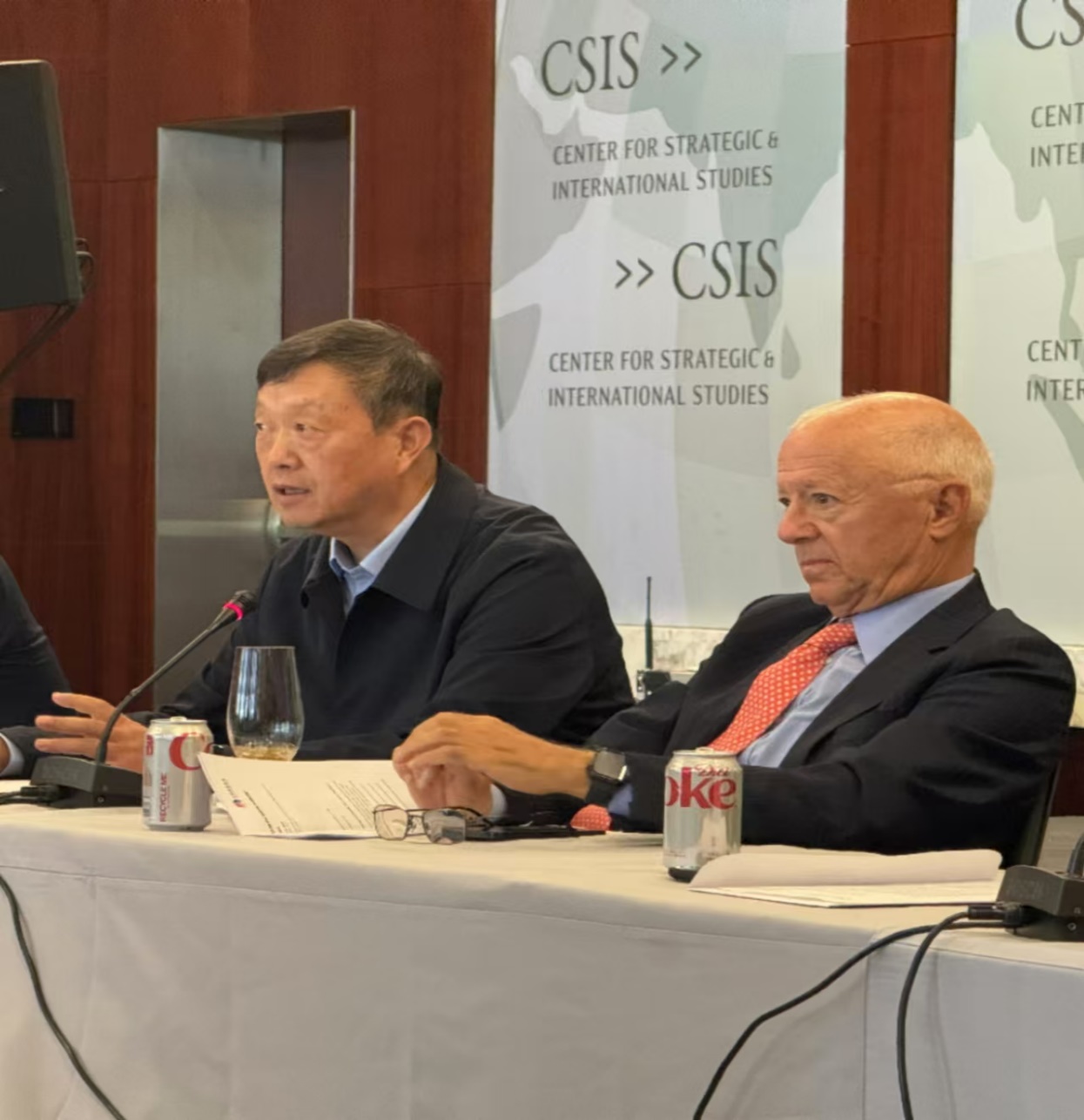 图:王春晖教授在美国国际战略研究中心(CSIS)学术交流。右一为美中全国关系委员会主席斯蒂芬·欧伦斯。