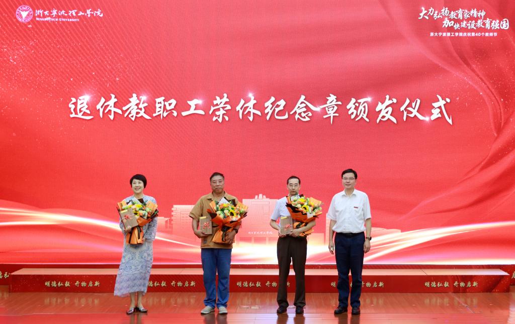 获奖教师代表徐亦冬发言,感谢学校为教师提供的良好环境,结合自身经历,告诉大家不要自我设限,努力成为多任务系统。未来希望能够在教学科研、管理服务方面,踏出更加坚实的一步,为浙大宁理的教育事业贡献更多的智慧和力量,为每一位学生的未来努力奋斗。退休教职工代表刘建民发言,衷心感谢学校和学院历届领导多年来的关心照顾,感谢老师们一直以来的关爱和友谊,也感谢浙大宁理这美丽的校园带来的无限美好的回忆和快乐。他表示,虽然退休了,但是心永远离职不离岗,关心关注学校发展,继续发光发热。