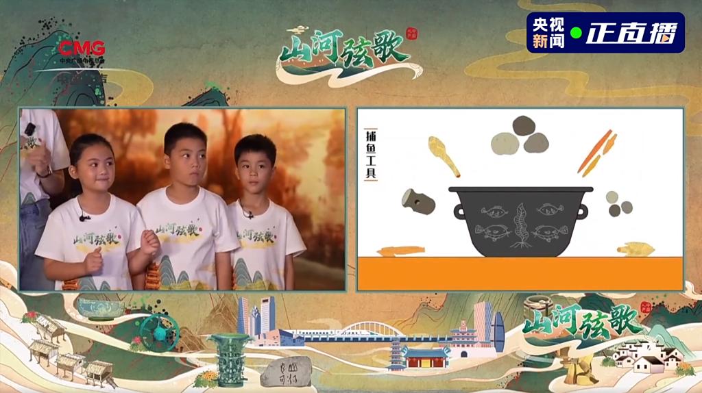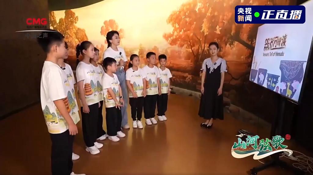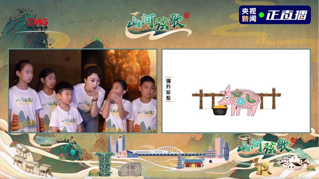 在节目中,有一段由央视主持人带领一群小朋友组成的山河弦歌研学团参观研习河姆渡文化,在研学之旅中有一段特别准备的短片《器说河姆渡》,以创新的动画表现形式,把7000年前新石器时代河姆渡人的生产生活场景生动的呈现出来,从泛舟捕鱼、搭弓猎兽、驯养家禽到骨耜耕土、点种播稻、谷镰收割、到煮蚕抽丝、纺轮织布等等,让研学团的小朋友们在欢快的音乐节奏中以新颖的形式感受古人智慧、领略远古河姆渡文化。
