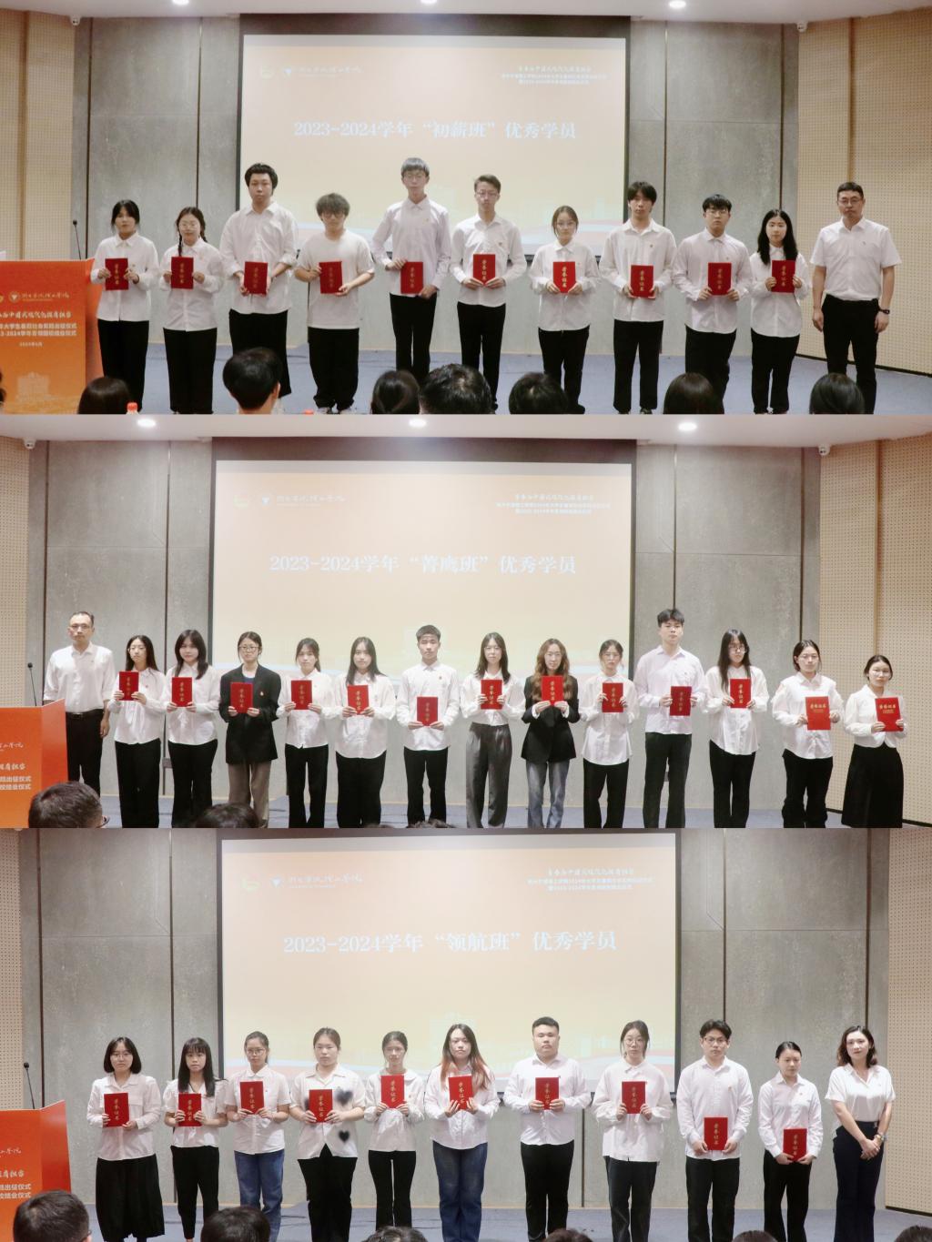 出征仪式上,还举行了2023-2024学年青领团校结业仪式。自2023年12月启动第三期“初薪班”“菁鹰班”“领航班”学生骨干培训班开班以来,全校581名新生团支委、204名校级组织学生干部、144名学生社团骨干顺利结业。学校团委书记周春晓宣读优秀学员名单,组织部部长李炜、学工部部长应中元、宣传部副部长韩晶晶分别为“初薪班”“菁鹰班”“领航班”优秀学员代表颁奖。