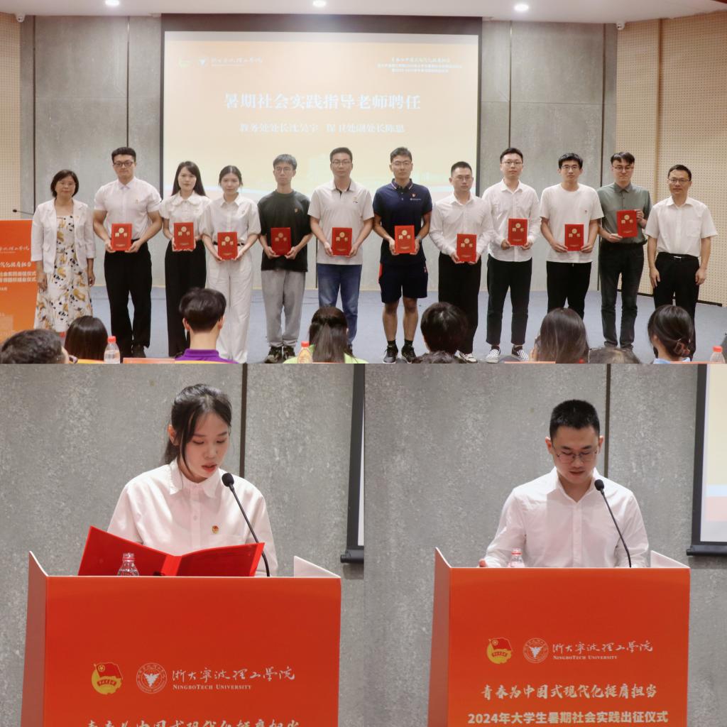 教务处处长沈昊宇、保卫处副处长陈恩为2024年大学生暑期社会实践指导教师代表颁发聘书。土建学院团委书记、文化薪传实践团指导老师吴启富,设计学院鸿鹄学社实践团负责人朱佳怡分别代表指导老师和实践团队发言。他们用自己的实践经历和感悟,号召同学们投身社会实践活动中,在实践中增强责任感和使命感,奋力书写为中国式现代化挺膺担当的青春篇章。