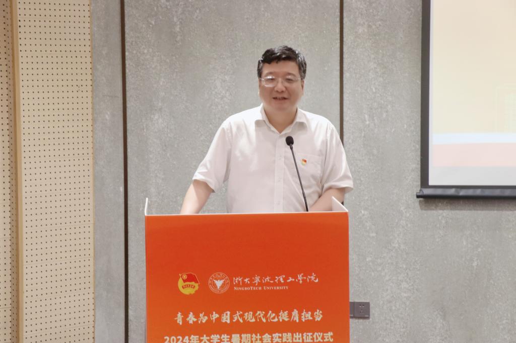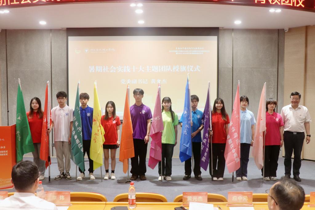 黄光杰做动员讲话,并为十大主题团队代表授旗。他强调,大学生暑期社会实践是引导和帮助广大青年学生走进社会体悟国情,也是上好与国情相结合“大思政课”的重要途径。今年,已经有202个团队、256名教师、3578余名同学整装待发,希望大家做到以下三点:一是筑牢信仰之基,胸怀“国之大者”的高远志气。希望同学们能向榜样看齐,走进基层、躬身实践,胸怀“国之大者”、争做“国之大才”,在学思践悟中坚定信念、行稳致远,打牢堪当民族复兴重任时代新人的精神底色。二是丈量祖国大地,锤炼“刚健有为”的铮铮骨气。希望同学们用脚步丈量祖国大地,以勇担使命、无惧挑战的精气神,走进乡村、社区、企业,与村民座谈、看社区变化、谈企业发展。三是勇于开拓创新,积蓄“自信自强”的深厚底气。希望同学们紧抓时代脉搏,瞄准科技前沿,自信正义、实践创新,展现中国人的自信自强、奏响浙大宁理青年的奋进凯歌。
