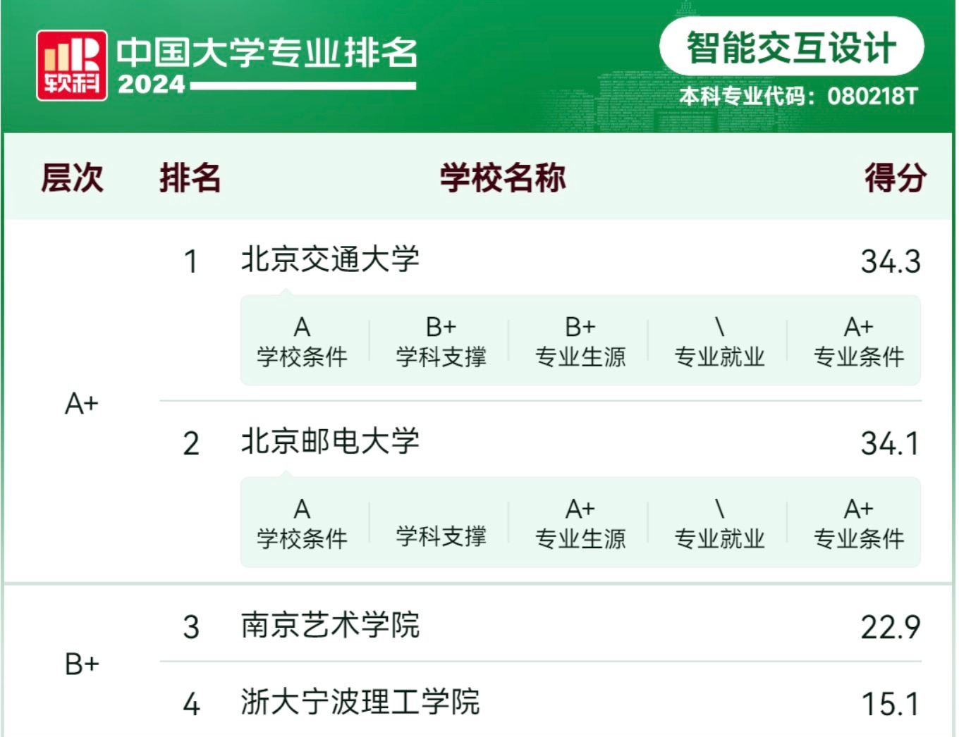 日前,高等教育专业评价机构软科正式发布“2024软科中国大学专业排名”,我校智能交互设计专业排名全国第4位,这是我校智能交互设计自2023年招生以来首次获得大学专业评价机构排名。