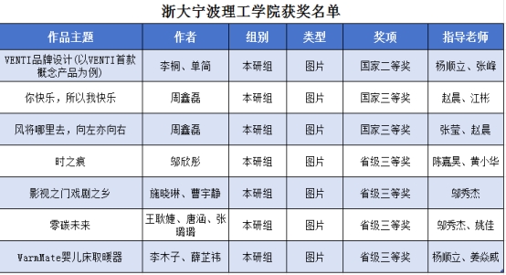 本科及研究生组作品中,李桐和单简同学在杨顺立、张峰两位老师的指导下共同创作的《VENTI品牌设计(以VENTI首款概念产品为例)》荣获国家二等奖,这部作品充分展示了他们对品牌设计与产品创新的深刻理解。由赵晨、江彬和张莹老师指导,周鑫磊同学创作的《你快乐,所以我快乐》和《风将哪里去,向左亦向右》分别获得了国家三等奖,展现了他在设计领域的多元化才能和创新能力。此外,邬欣彤同学的作品《时之痕》,施晓琳和曹宇静同学的作品《影视之门戏剧之乡》,王耿婕、唐涵和张璐璐同学的作品《零碳未来》,李木子和薛芷祎同学的作品《WarmMate婴儿床取暖器》均获得了省级三等奖,这些作品不仅体现了浙大宁理学子对设计的热情与追求,也展示了他们在设计领域的独特见解和创新思维。
