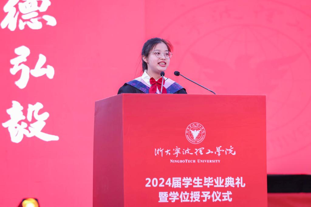 浙江省优秀毕业生、宁波市励志标兵、商学院财务管理201班李想同学表本届毕业生向精心育人的母校、授业解惑的师长们、默默支持陪伴的亲友们表示衷心的感谢。希望每一位毕业生在历经大学的淬炼后都能以从容的心态和笃定的信心,直击困难、不负韶华,带着学校的期望、老师的教诲、朋友的鼓励,成为新时代奋勇前进的搏击者,以青春之名、赴时代之约。