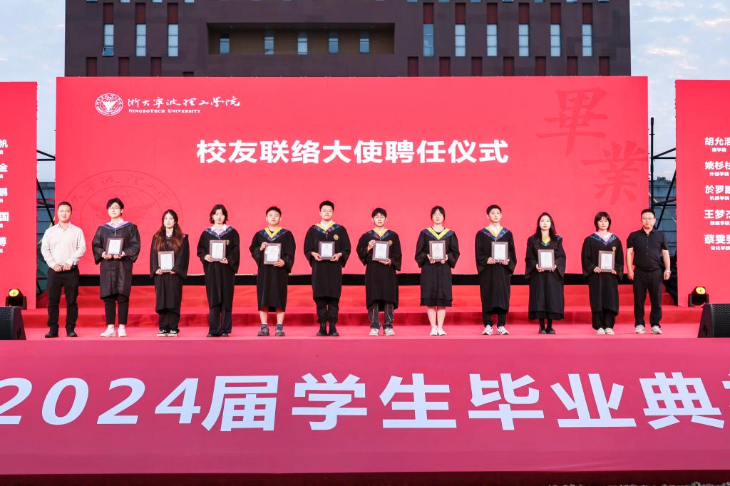 典礼上还举行了校友联络大使聘任仪式,学校校友总会副会长、宁波校友会会长徐春浩和温州校友会会长郑斌来到现场,为校友大使颁发聘书。各位校友大使表示今后将广泛联络校友,积极联系母校,常叙师生情、凝聚同窗谊,宣传母校办学成就,传播母校发展故事,为母校和校友事业的发展做出积极贡献。徐春浩也为毕业生们送上祝福,希望他们未来可以加入到当地的校友分会,成为这个大家庭中的一份子。