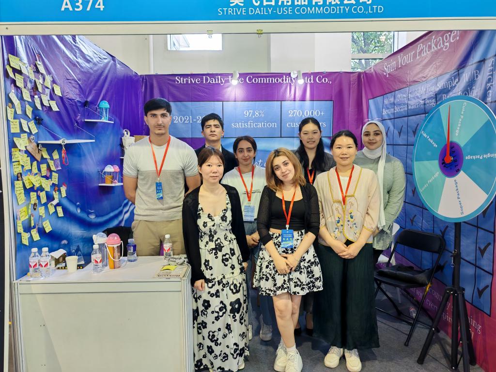 5月24日,国际生们齐聚宁波国际会展中心,亲手布置自己的展位。5月25日-26日在正式比赛过程中,在谈判环节,他们以成熟的姿态、专业的谈判术语赢得了评委们的高度评价;在发布会环节,他们凭借精准的市场分析、独特的选品眼光以及高效的团队协作能力,成功吸引了评委们的目光;同时这个创意的展位也吸引了其他参赛选手的目光,在比赛过程中他们也结识了很多志同道合的新朋友。