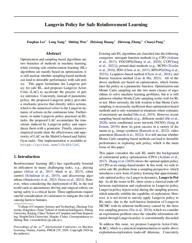 近日,第41届国际机器学习大会ICML(International Conference on Machine Learning)公布2024年论文最终录用结果。浙大宁波理工学院计算机与数据工程学院联培研究生雷丰豪(导师文世挺教授)为第一作者的论文“Langevin Policy for Safe Reinforcement Learning”被大会接收。