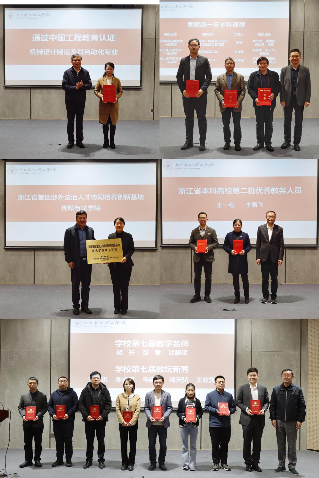 会议还表彰了2023年度教学先进。校领导为通过中国工程教育认证专业、国家级一流本科课程团队、浙江省本科高校第二批优秀教务人员、学校第七届教学名师和教坛新秀颁发证书,为省级涉外法治人才协同培养创新基地授牌,同时还通报了浙江省第十三届青年教师教学竞赛、浙江省第三届高校教师教学创新大赛、宁波市第三届高校教师课堂教学创新能力比赛获奖名单。