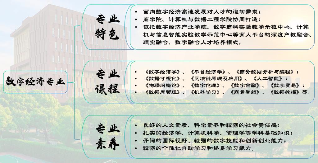 学校积极响应省政府数字经济创新提质“一号发展工程”,整合商学院、计算机与数据工程学院等专业交叉学科群资源,依托数字经济现代产业学院、数字商科实验教学示范中心、计算机与信息智能实验教学示范中心等平台,设立数字经济专业。该专业旨在以“经济学+计算机技术+管理学”等基础知识为基石,培养具备国际化视野和创新性思维,能在数字经济相关的各级管理部门以及区块链、物联网、人工智能、电子商务等新兴领域从事数据经济分析、行业管理工作的高素质应用型数字经济人才。