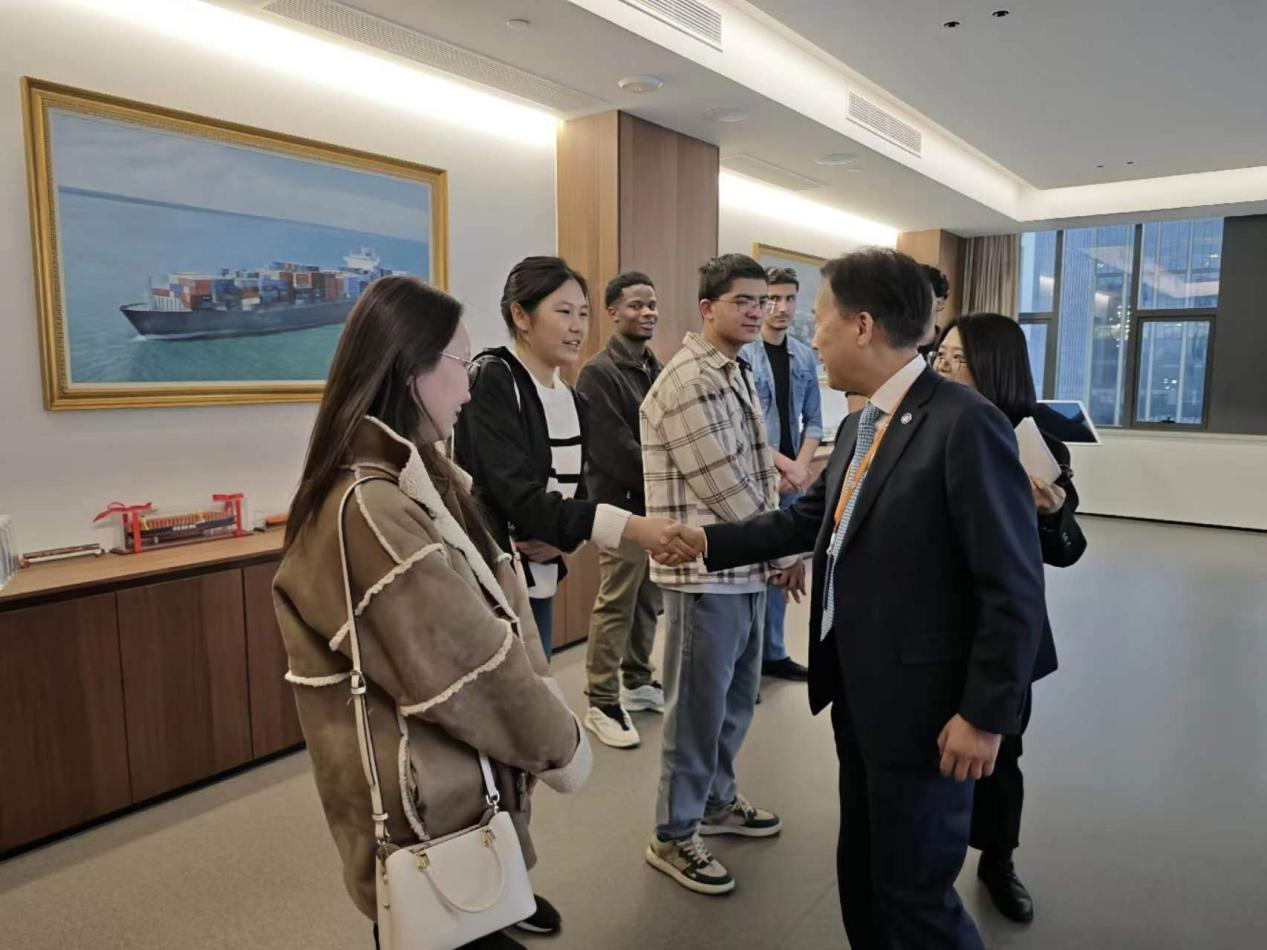 东南物流集团党群办副主任徐阳芳为同学们详细介绍了公司经营概况、营收情况、业内排名以及企业运营的陆运航线、海运航线。同时,她还展示了数字化实时更新的运输大屏,所有航线上的船只、火车、货车都会实时显示在大屏上。这让国际生们对我国物流行业的管理模式和数字化运营有了更加直观的认识。值得一提的是,在此次活动中,学生们有幸见到了东南物流的创始人贾骏董事长。贾董亲切地与学生们打了招呼并握手,让国际生们感受到了企业的热情和友好。