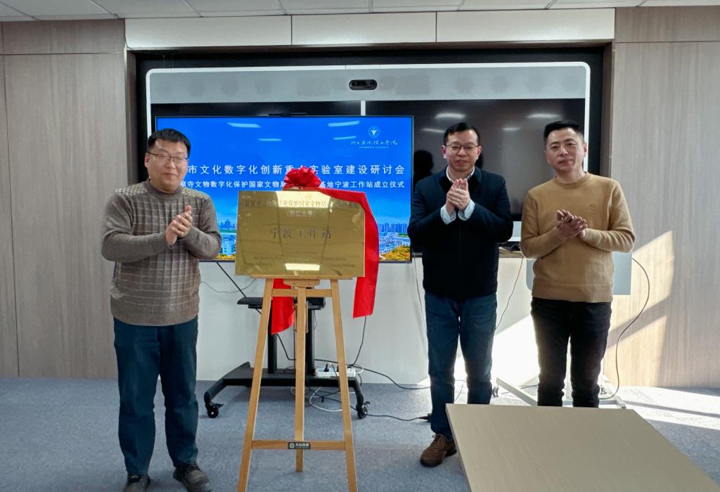 1月23日下午,宁波市哲学社会科学重点实验室——浙大宁波理工学院文化数字化创新实验室建设研讨会在浙大宁波理工学院召开,同时成功举行石窟寺文物数字化保护国家文物局重点科研基地宁波工作站成立仪式。浙大宁波理工学院副校长鲁东明,宁波市社科联(市社科院)副主席、副院长蔡骋宇,石窟寺文物数字化保护国家文物局重点科研基地副主任、浙江大学艺术与考古图像数据教育部重点实验室副主任刁常宇,及宁波市首批重点文化研究基地的负责人及宁波市数字文化建设相关企业、研究机构、公共文化机构的专家等参加了本次会议。