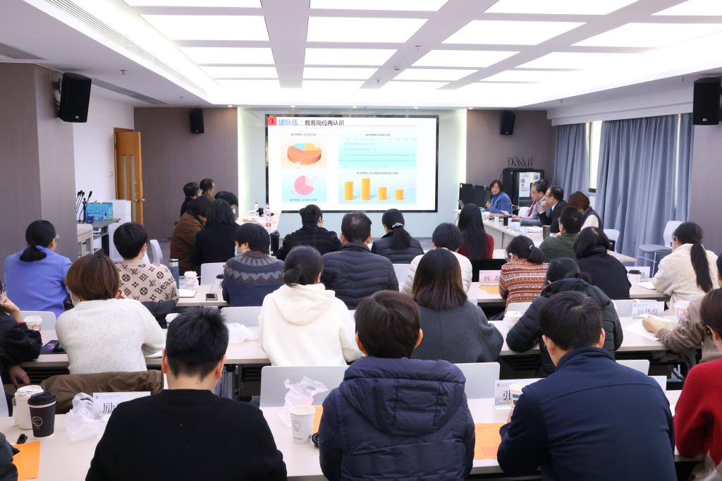 教务处处长沈昊宇做新年读书分享。她以习近平总书记发表的新年贺词为指引,结合国家要求和区域需求,回顾了2023年教务管理人员的工作与取得的成绩,结合学校发展对2024年教务工作做了分析,提出“建队伍、重协同、创机制、强服务”的发展思路。在研讨交流环节,王一程等8位一线教务员围绕教务工作特点、教学管理规范、教务运行效率、职业发展方向、个人能力提升等方面发言,与会人员就日常工作典型案例及易错环节展开了热烈讨论。