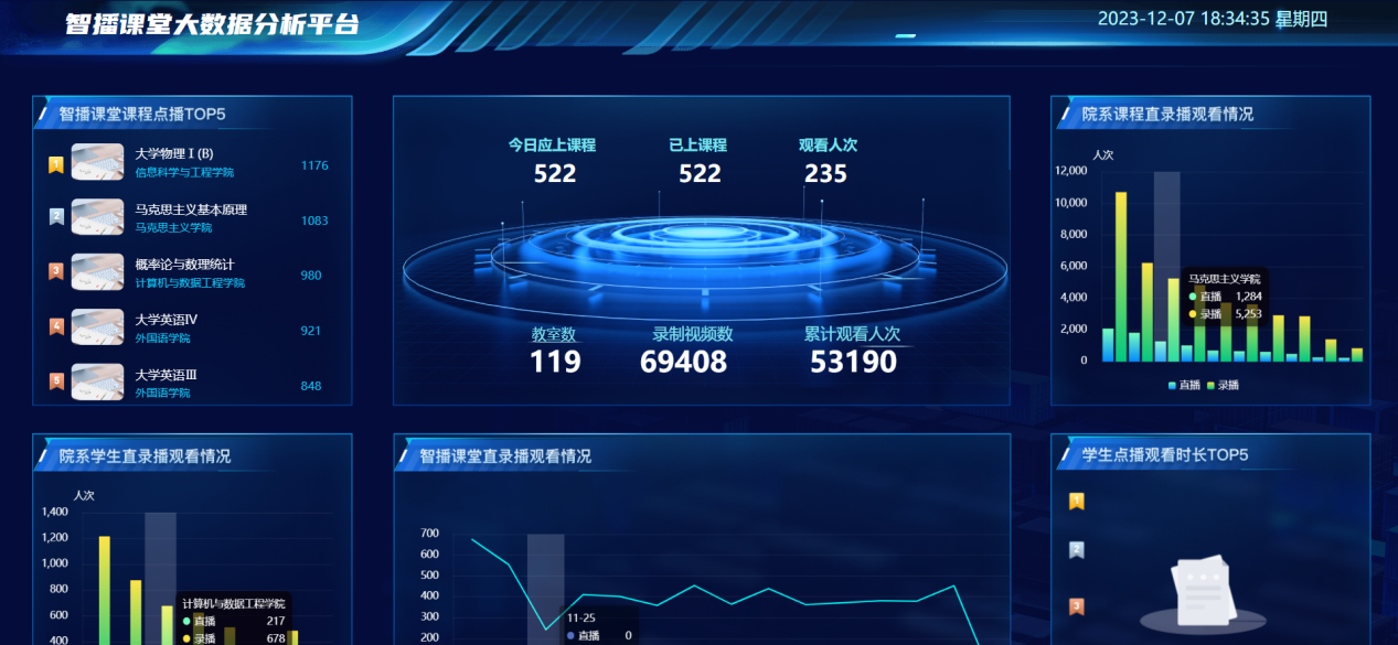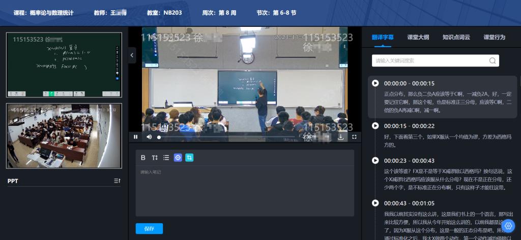 “宁理云学堂”平台支持线上线下一体化、课内课外一体化等全场景教学应用,服务教学模式、教学内容、学习方式、学习时空改善,记录学生学、教师教、督导督的全过程,有效促进教学质量闭环管理。“智播课堂”根据教务课表将教室教学过程实时记录成流媒体文件,同步生成文本、文本翻译、PPT课件、热词标签,成为网上可实时直播、点播的学习资源。“督导平台”打通线下教室和线上平台,支持灵活开展线上、线下以及混合式督导,在观看课程录播视频时即可完成督导问卷填写与评价。