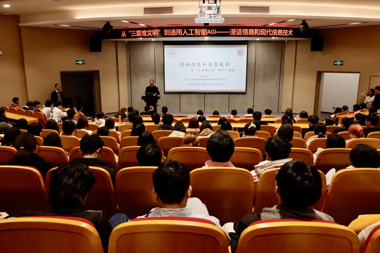 2023年12月6日下午,浙大宁波理工学院在启新大讲堂举办“‘从三星堆之谜’到通用人工智能AGI”的报告讲座,中国科学院院士,南京大学教授、博士生导师,中国光学学会(COS)会士,美国光学学会会士,美国物理学会会士祝世宁先生莅临我校,和两百多位同学漫话信息和现代信息技术。校长杨德仁院士主持讲座,现场座无虚席,祝院士娓娓道来、深入浅出,同学们认真聆听,在互动环节积极发言,整场讲座反响热烈。
