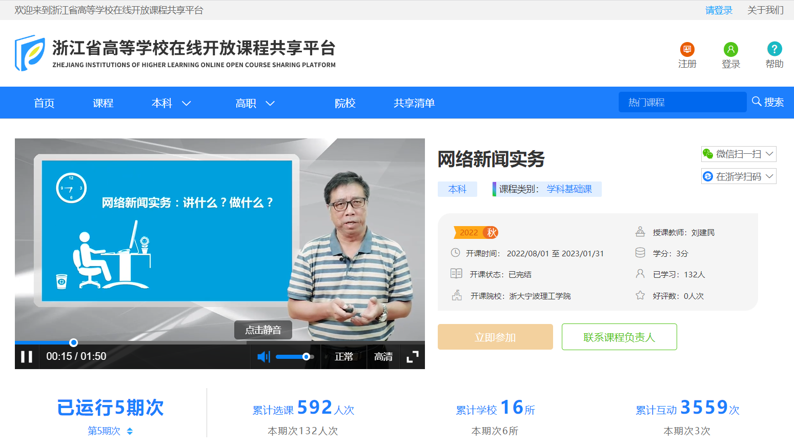 《行走的新闻》构建“行访叙写”集群化真实合演矩阵和“新闻魅力课程群”,创新了专业教育、实践训练、思政育人三位一体的新闻传播人才培养模式。该成果研究理念先进,政治性强,成果育人成效显著,社会反响大,成果3次受到时任浙江省省长郑栅洁批示。《网络新闻实务》充分利用 “行走的新闻”平台,充分融入校内外实践基地实习实训,实现“知识与技能”、“过程与方法”、“情感、态度、价值观”三维功能的整合,进一步增加新闻策划、新闻推送教学训练,强化实践能力培养。探索线上线下复合式教学模式,线上教学资源累积达700分钟。