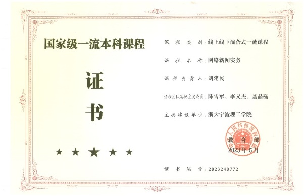 构建“三位一体”新闻传播人才培养模式,《行走的新闻》获浙江省高等教育教学成果一等奖(2022.1),《网络新闻实务》获批国家级一流课程(2023.5)
