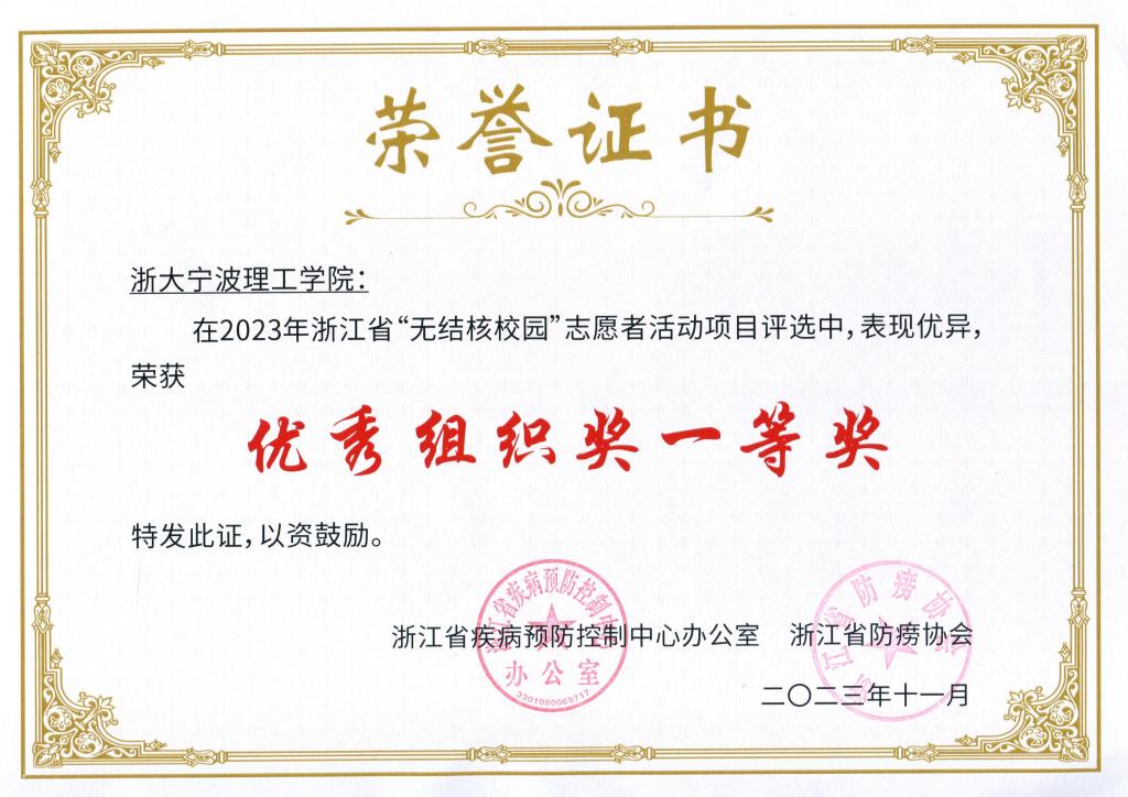 近日,由浙江省卫生健康委员会、浙江省疾病预防控制局主办,浙江省疾病预防控制中心承办,浙江省防痨协会协办的浙江省百千万志愿者结核病防治知识传播提升行动工作部署会暨“无结核校园”志愿者活动项目总结会在杭州顺利召开。我校在全省20所试点大学中脱颖而出,获2023年浙江省“无结核校园”志愿者活动优秀组织奖一等奖。