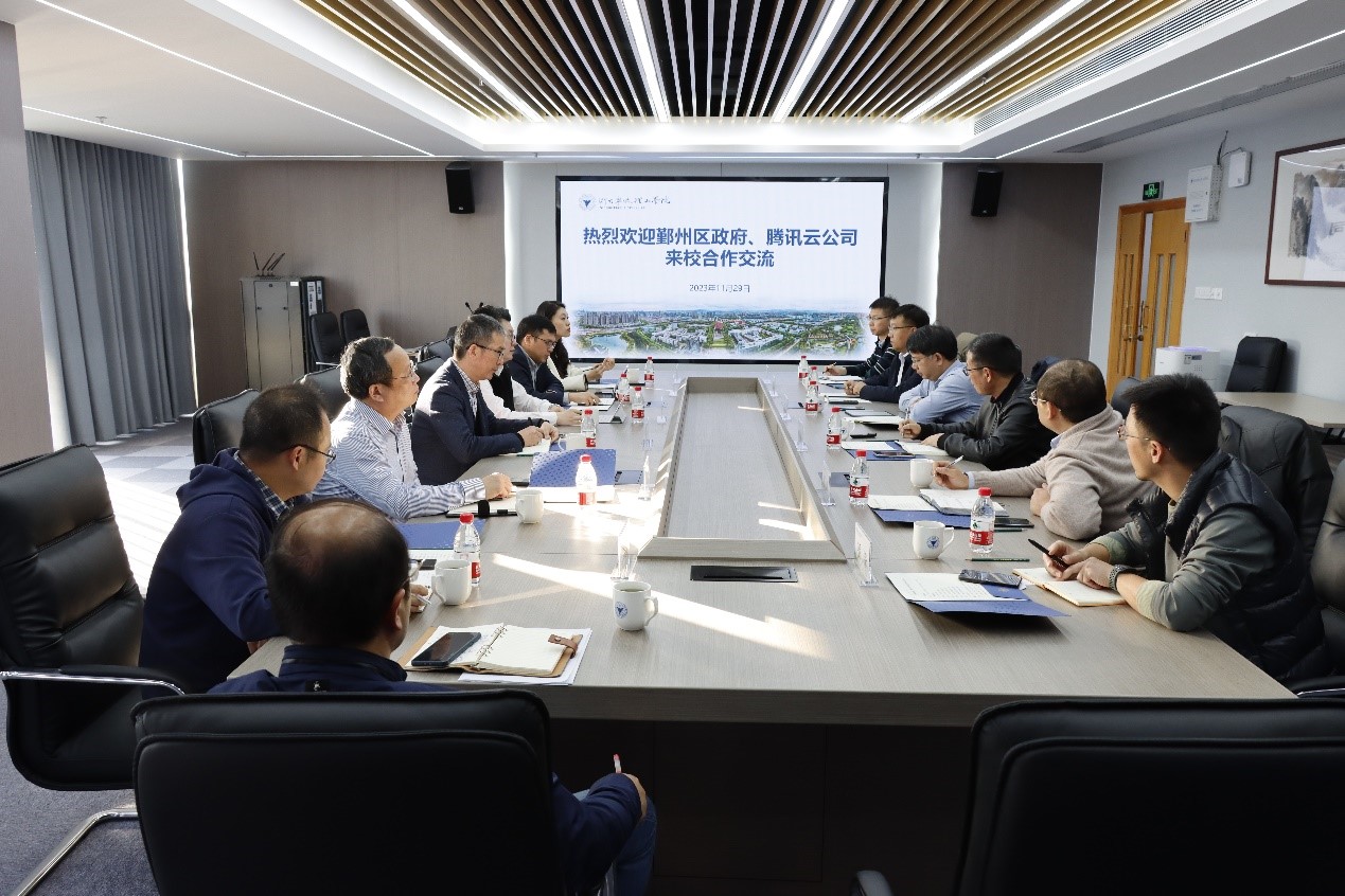 11月29日,鄞州区府办副主任李小海一行携腾讯云公司代表到访我校。学校副校长鲁东明出席了会议,科研处、地方合作处、信息技术中心及数据学院相关负责人参加了会议。