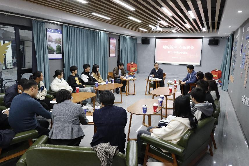 参加交流的同学来自各学院,其中好几位是与校庆日同天生日的新生,大家对开学典礼上同学校一起庆生印象深刻。“我是今年八月份到学校工作的,跟大家一样,也算是‘新同学’,同学们可以畅所欲言,随时可以补充。”在徐方的鼓励下,同学们踊跃发言,交流自己对大学生活的理解和看法,提出心里面的疑虑与困惑。 “如何激发同学们参与活动的积极性?”“等我们这届毕业的时候有保研的机会么?”“我是专升本的,感觉基础课上的比较快,有点跟不上。”“我们这个是新开的专业,学的内容很多,感觉比较忙,周末都要写作业,跟想象中的大学生活有些不一样。”“现在研究生就业的待遇也不算高,考研还有必要么?”“对未来职业规划方面还有些迷茫,老师们有什么建议么?”……,同学们结合两个多月来的体会,就专业认识、课程学习、学业规划、目标选择、人际关系处理、做好班级工作,以及图书馆座位预约、断电用水、考试安排、考勤管理、网络使用等学习生活各个方面表达想法、提出建议、寻求解答。与会教师认真倾听,积极回应,认真解答同学们关心的问题,现场同学也从同辈角度就一些问题给出自己的想法,交流氛围轻松自然、和煦暖心。