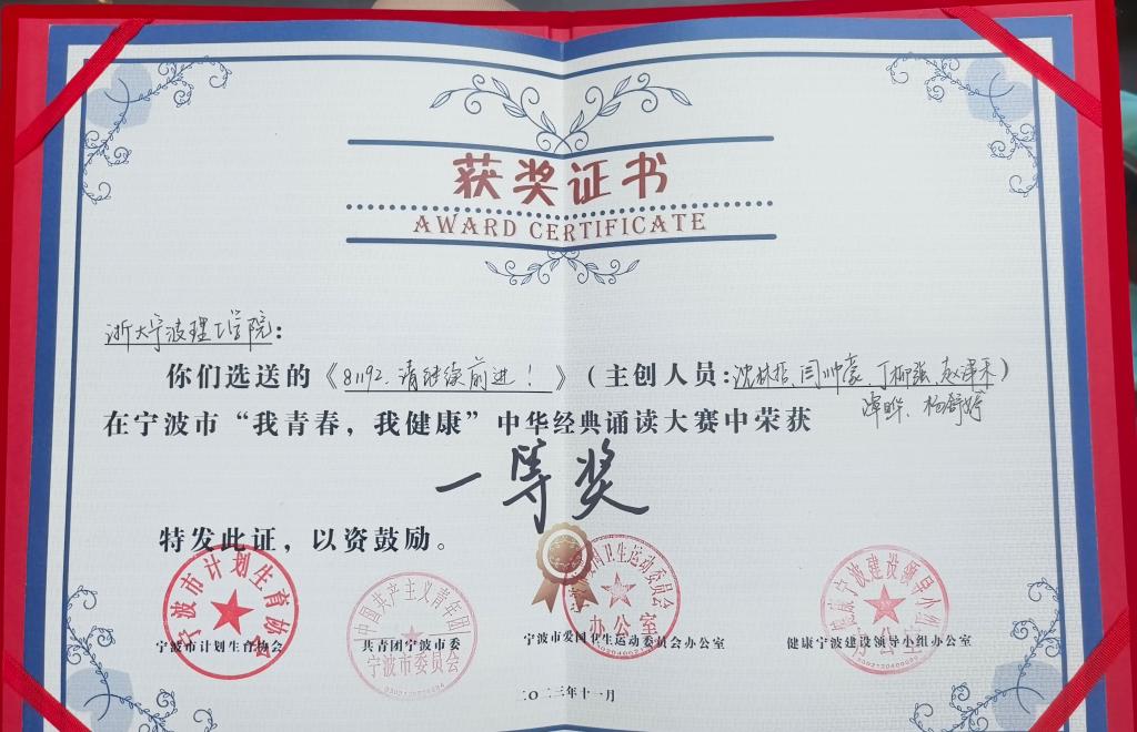11月16日,由宁波市计划生育协会、共青团宁波市委、宁波市爱国卫生运动委员会办公室、健康宁波建设领导小组办公室共同主办的宁波市“我青春·我健康”中华经典诵读大赛决赛在鄞州区社会组织创新园落下帷幕。我校《81192,请继续前进!》团队从宁波市各高校共计18支队伍中脱颖而出,荣获唯一一等奖。